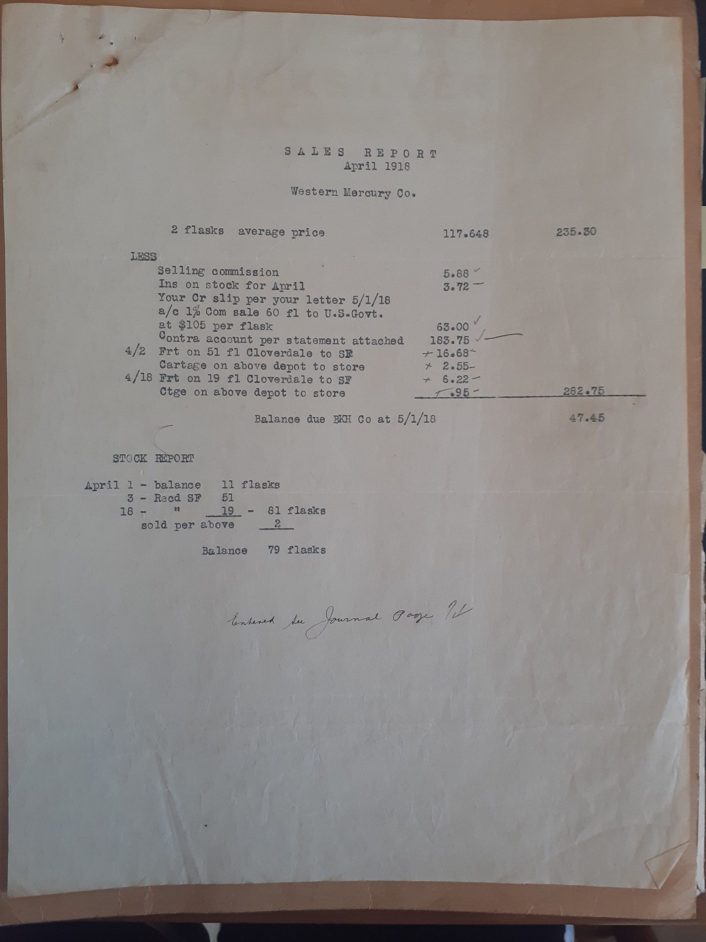 This document is a sales report from April, 1919 for the Western Mercury Co. The balance due to the B.K.H. Co. at 5/1/18 was $47.45.