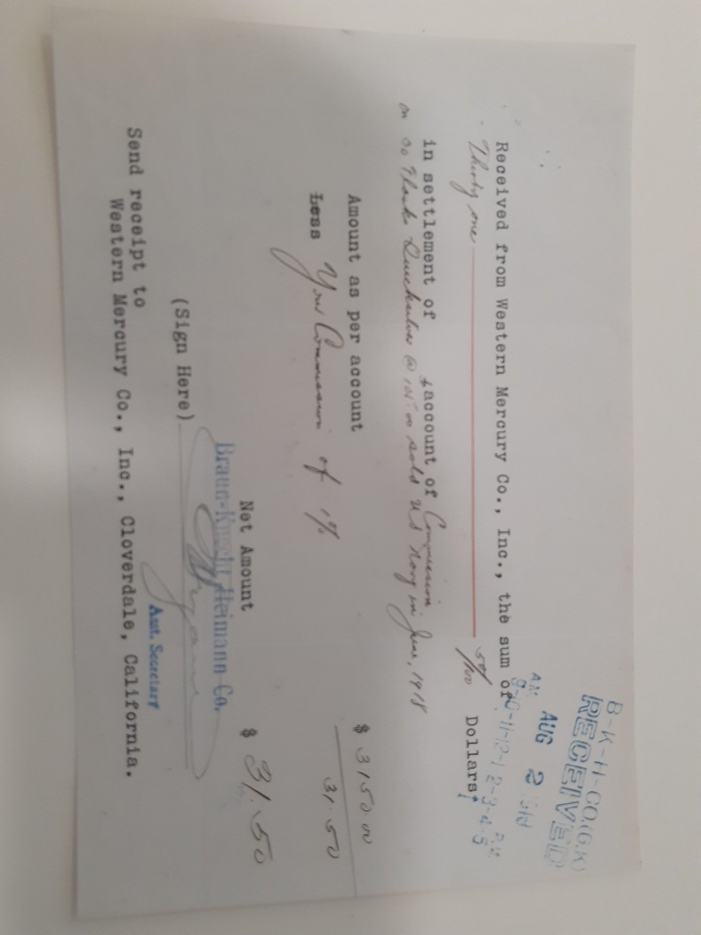 This document is a commission check received from the Western Mercury Co. by the B.K.H. Co. for a total of $31.50 for selling $3,150.00, a 1% commission.