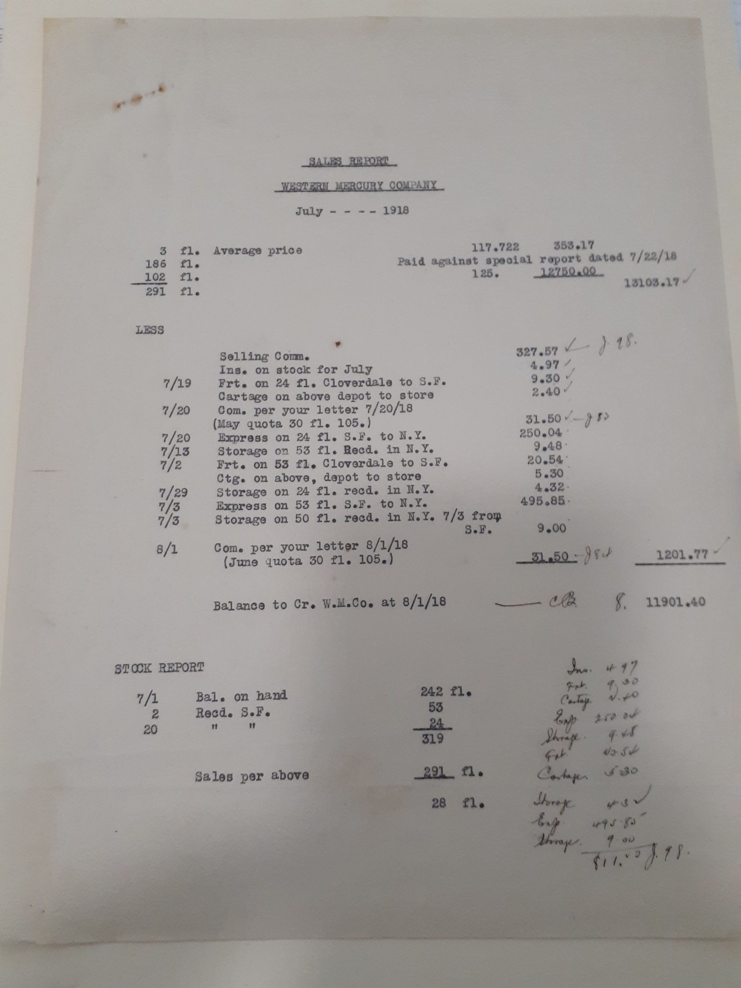 This document is a sales report for the Western Mercury Co. for July, 1918. As of August 1, 1918 they show to have a credit of $11,901.40.