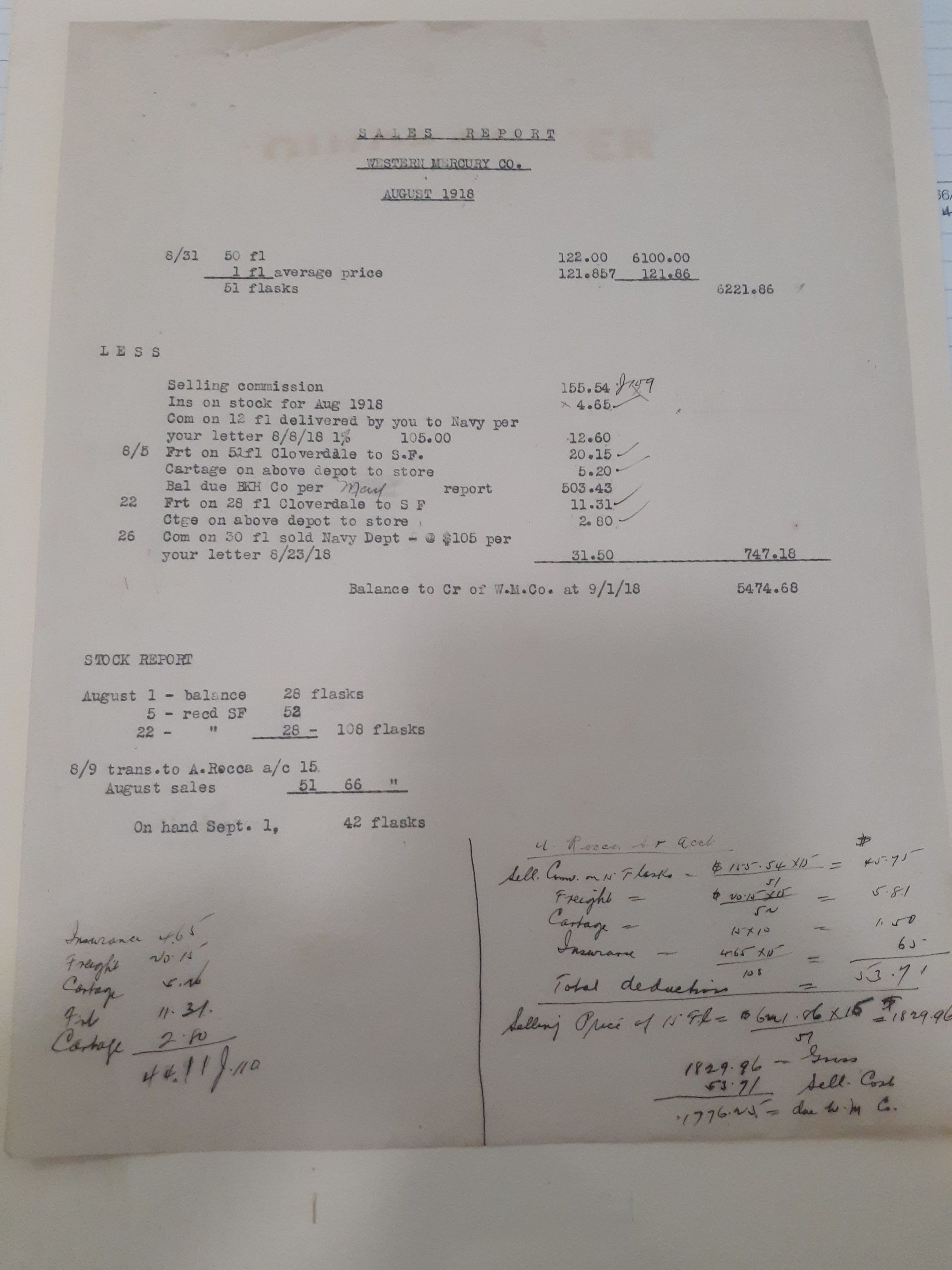 This document is a sales report for the month of August, 1918 from the Western Mercury Co. As of September 1, 1918 the balance to credit of the Western Mercury Co. was $5,474.68. This document has two hand written columns at the bottom of the page as well.Name/Title