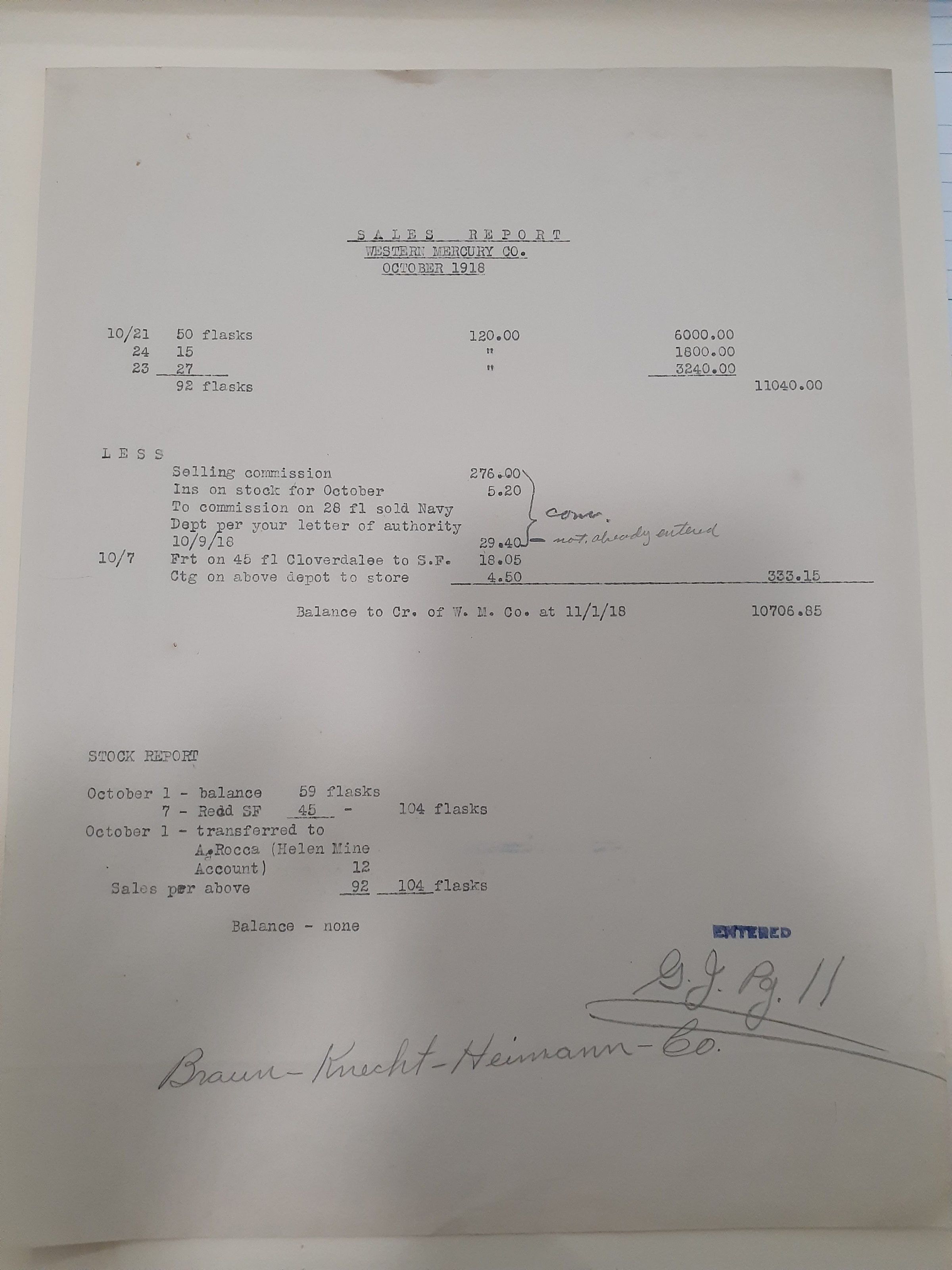 This document is a sales report from October 1918 for the Western Mercury Co. As of November 1, 1918, their balance to credit for the Western Mercury Co. is $10,706.85.