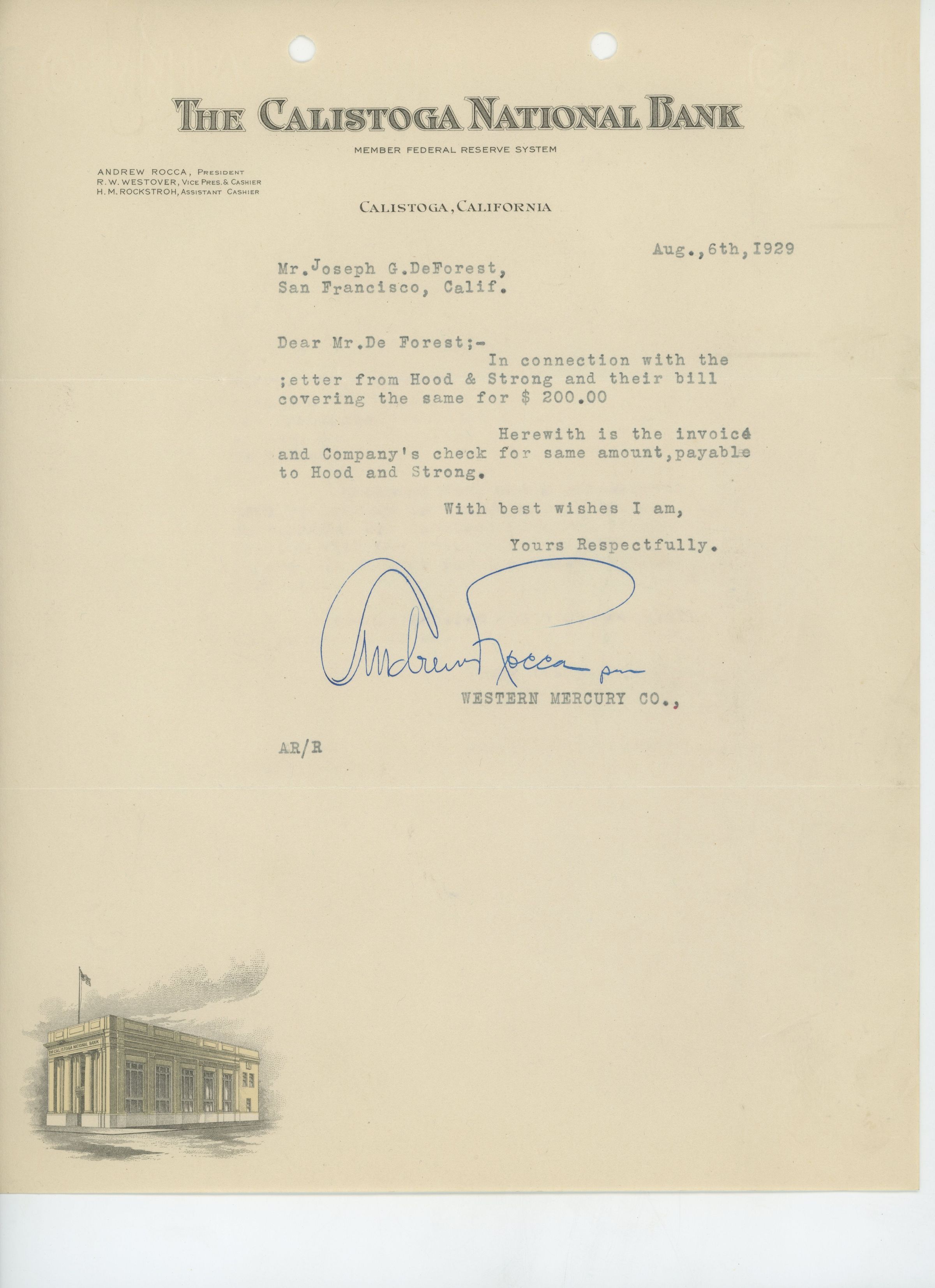 Letter to Joseph G. DeForest from Andrew Rocca regarding payment for a bill from Hood & Strong. Rocca says that he sent the invoice and a check for the bill to DeForest included with the letter.