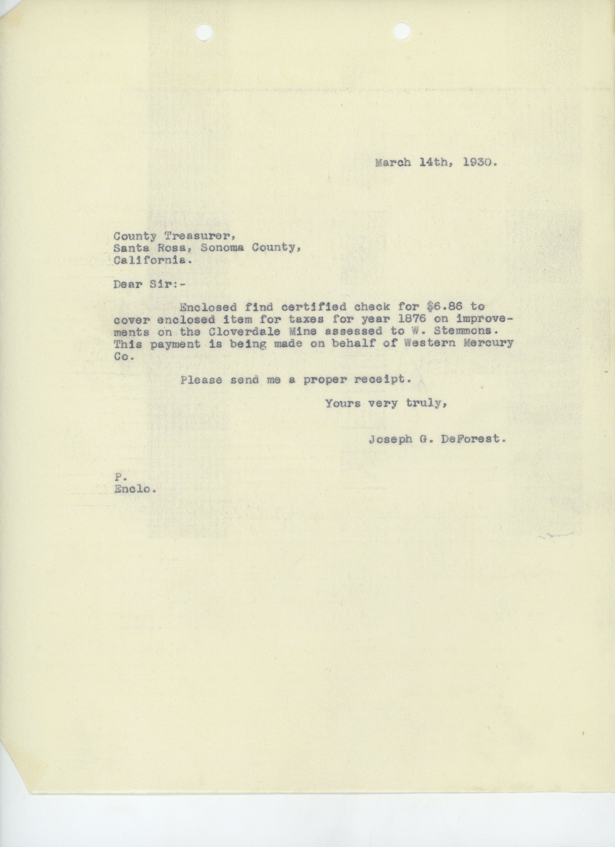 Letter to the Sonoma County Treasurer from Joseph G. DeForest regarding payment for delinquent taxes from 1876. The payment was worth $6.86.