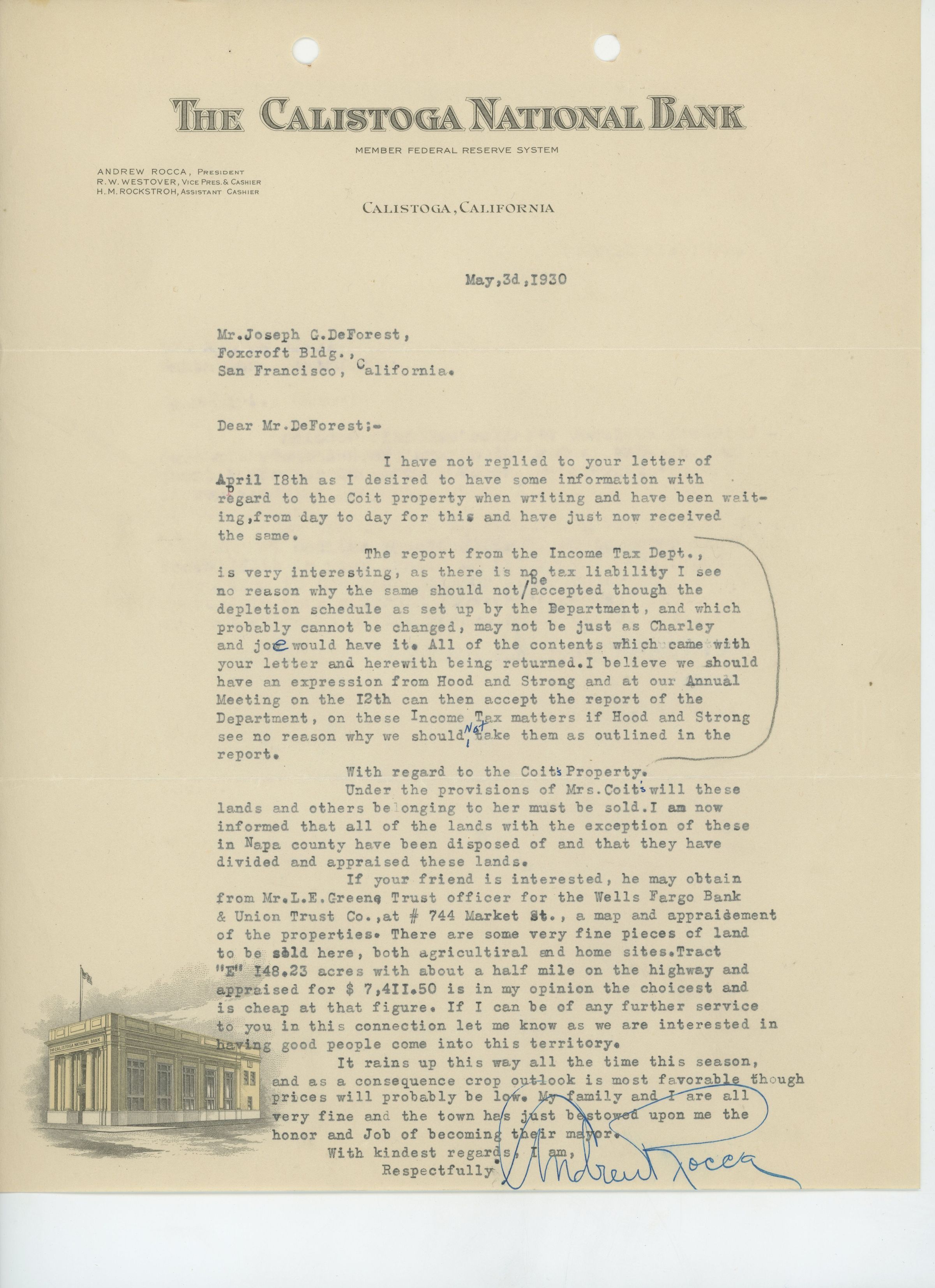 Letter to Joseph G. DeForest from Andrew Rocca regarding the status of land in Napa County owned by Mrs. Coit and a report from the Income Tax Department, including how the Western Mercury Co. should proceed.