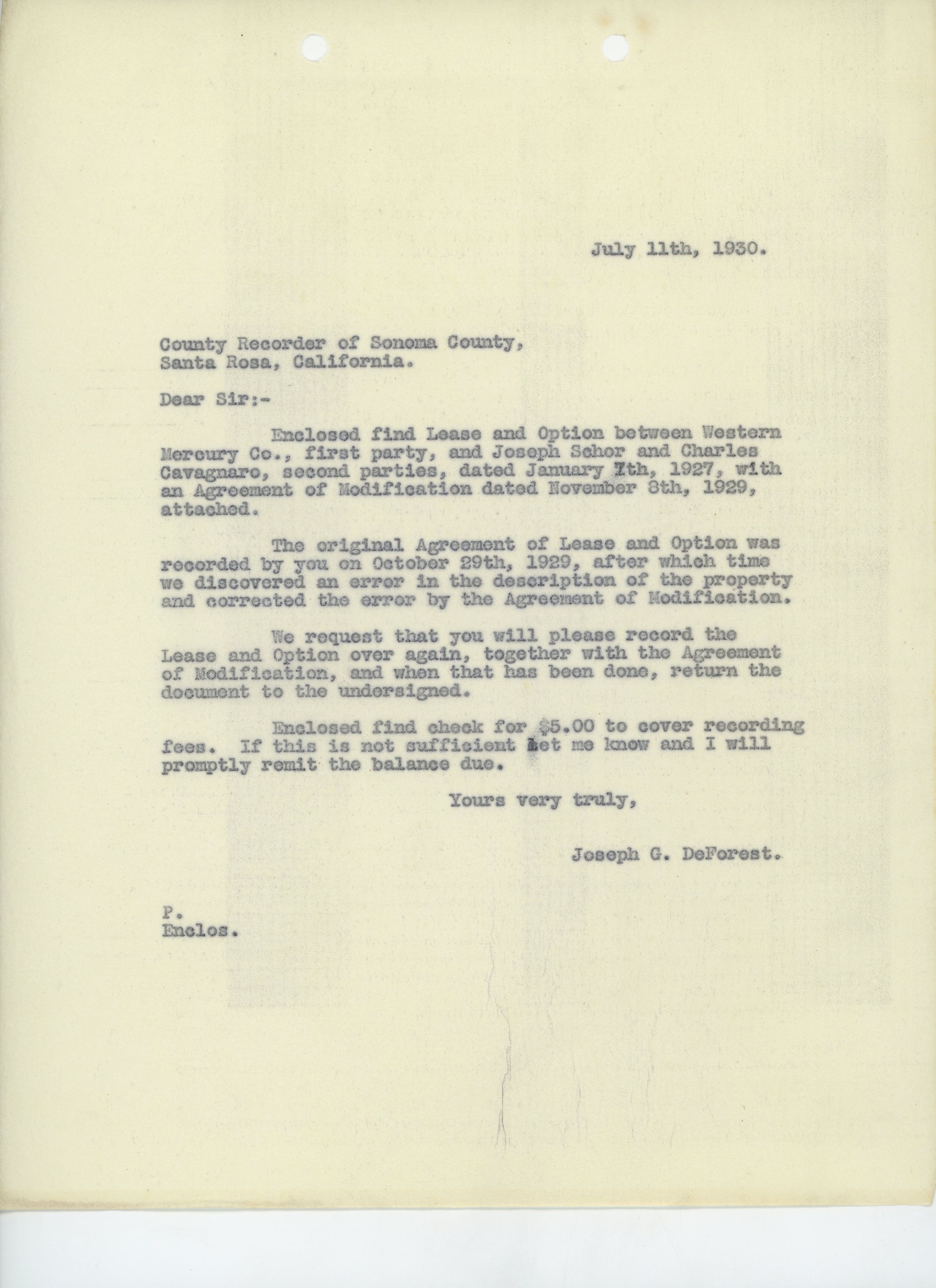 Letter to the County Recorder of Sonoma County from Joseph G DeForest regarding a lease and option between the Western Mercury Co. and Joseph Schor and Charles Cavagnaro. The letter details the agreement and requests that it be recorded in the office.Name/Title