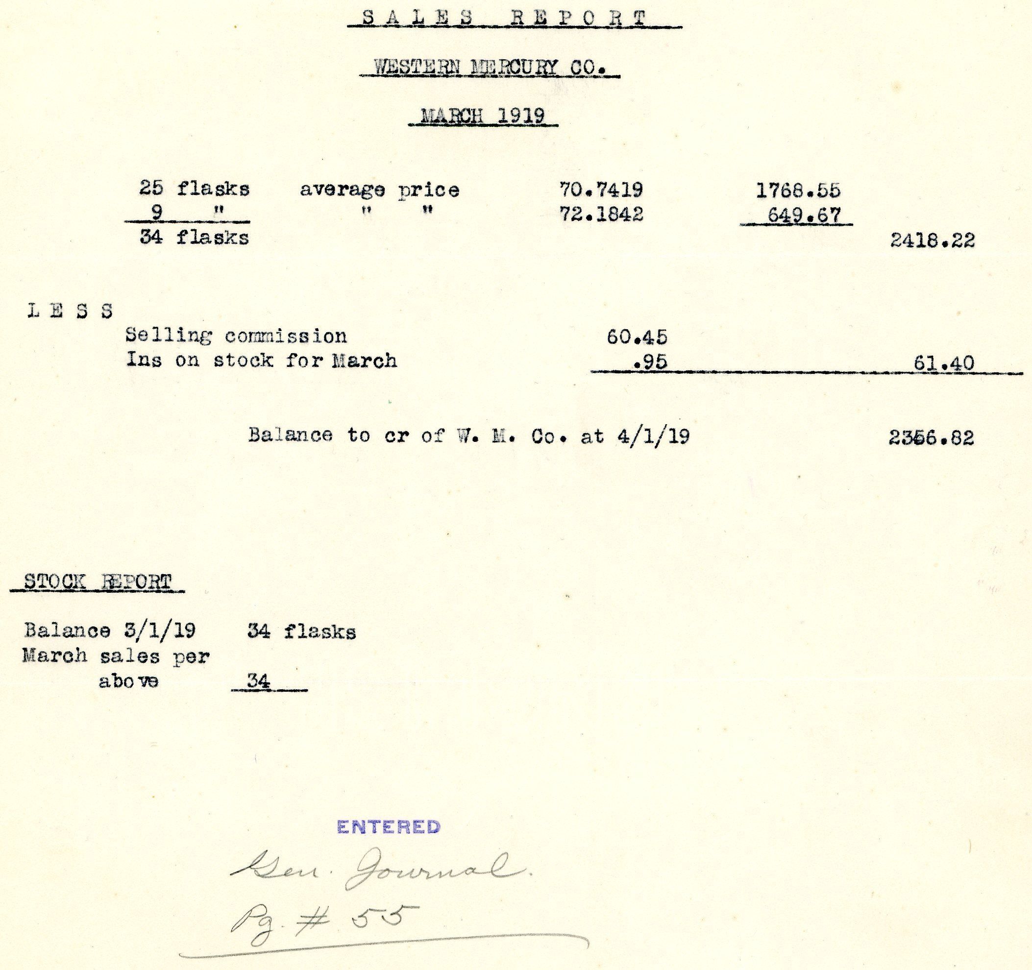 This is a sales receipt from the Western Mercury Co. It is for the cost of 34 flasks of mercury, which was $2,416.22. it also has the commission amount and includes a stock report.