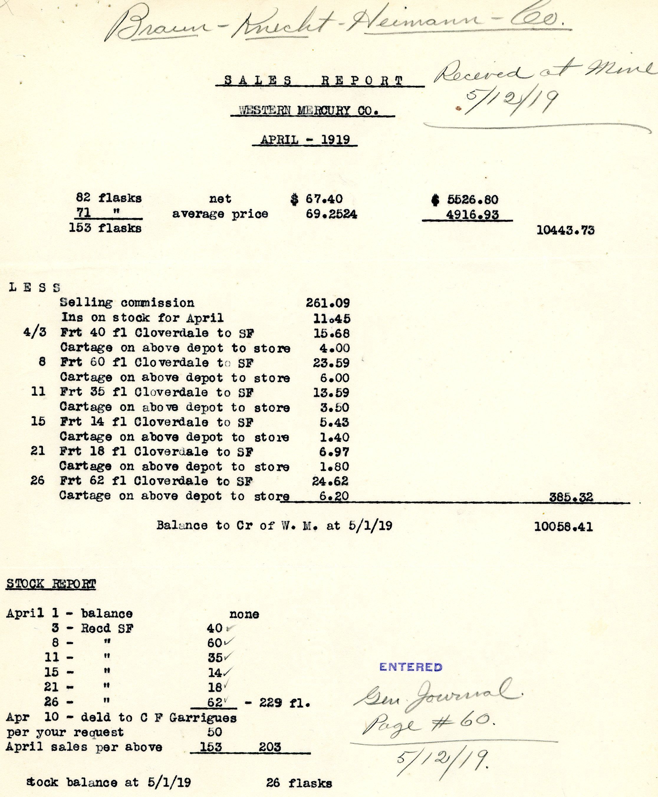 This document is a sales receipt/invoice for the sale of 153 flasks of mercury for a total of $10,058.41. This document is from the Western Mercury Co. from April of 1919. It also gives the commission totals and a stock report.Name/Title