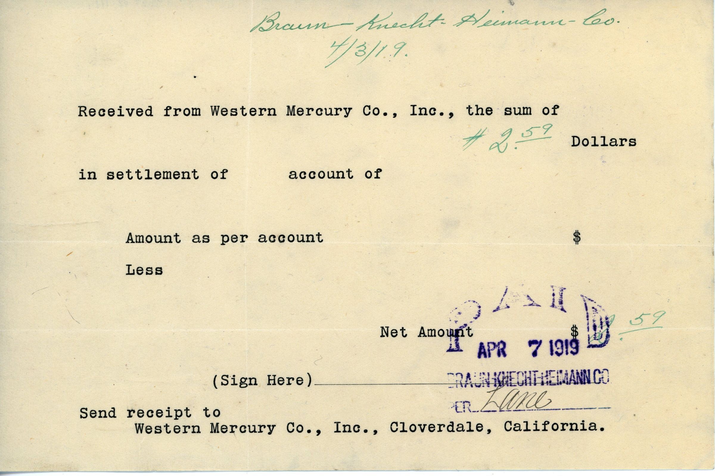 This small document is a receipt from the Braun-Knecht-Heimann-Co. to the Western Mercury Co. for sales amounting to $2.59.