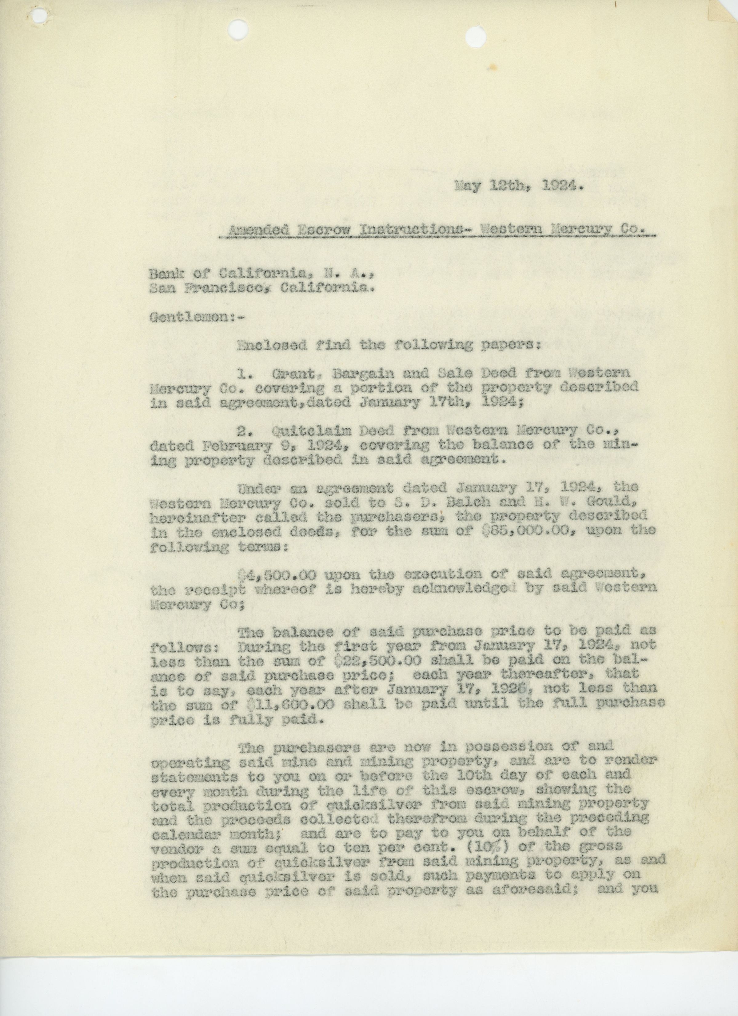 Unsigned letter to the Bank of California titled "Amended Escrow Instructions - Western Mercury Company," discussing the details of the sale of property from the Western Mercury Company to S. D. Balch and H. W. Gould. Similar to 2023.02.170 and 2023.02.171, but this letter states that the purchasers have taken possession and are operating the mine.Name/Title