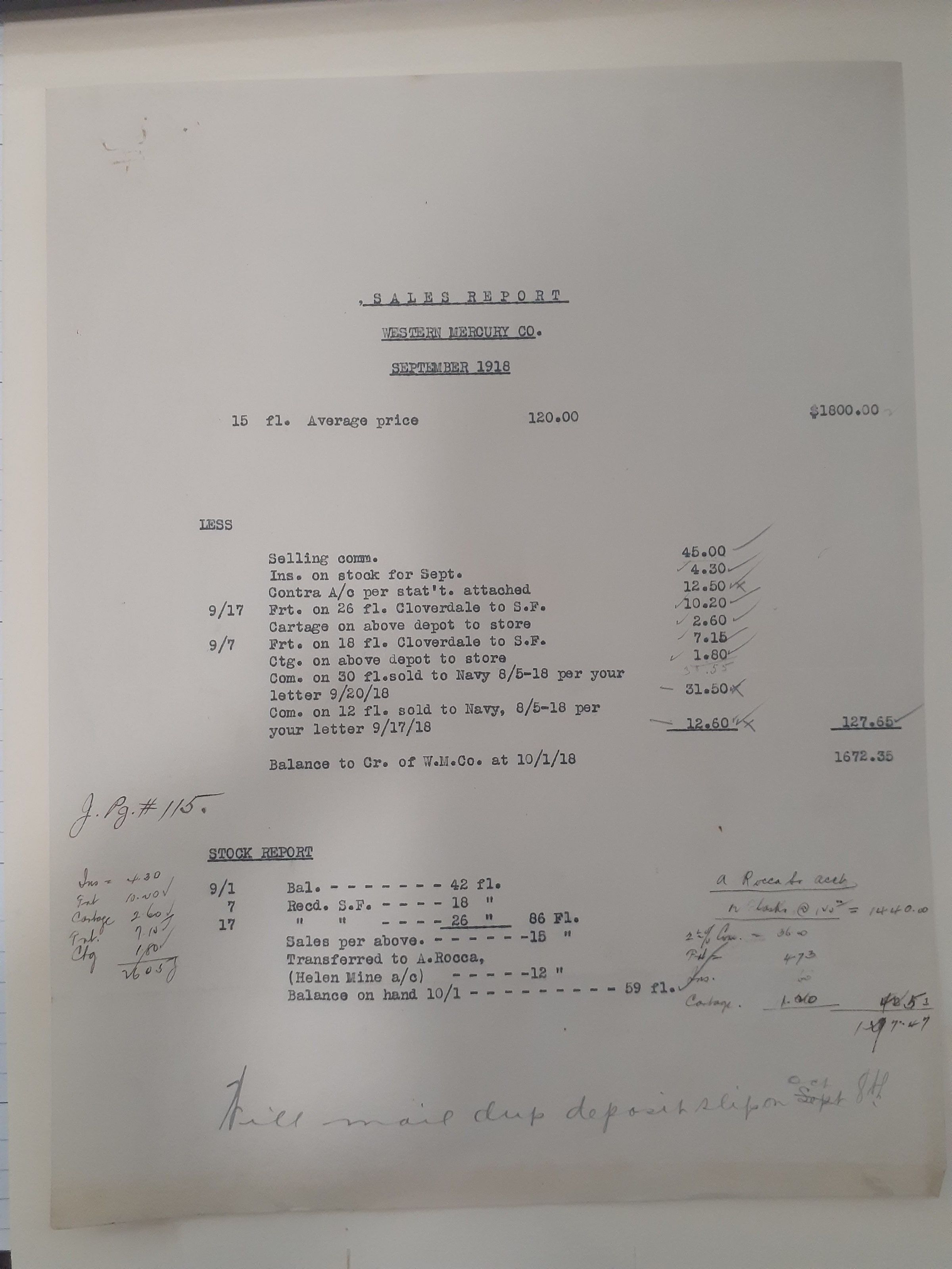 This document is a sales report from September 1918 for the Western Mercury Co. It states that as of 10/1/18 the Western Mercury Co. has a balance of credit for $1,672.35. This document has a lot of hand writing on it in pen, as well as one line at the bottom that is written in pencil.Name/Title