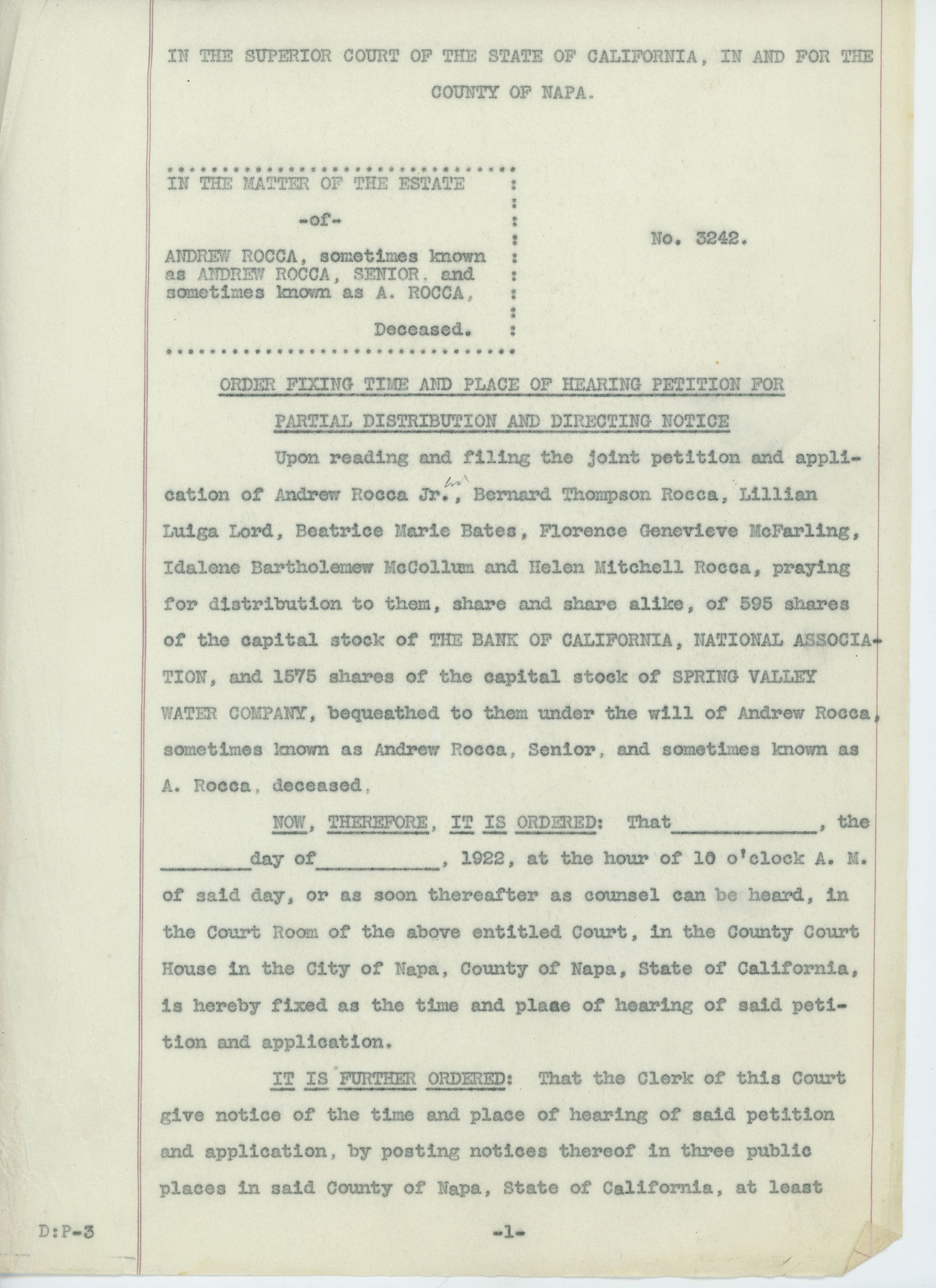 Copy of a court order from the Napa County Superior Court fixing a hearing related to the distribution of shares from the estate of Andrew Rocca, Jr., to his heirs and children. The date of the hearing is left blank in the copy.Name/Title