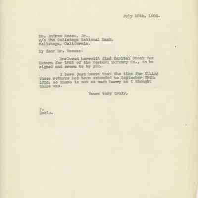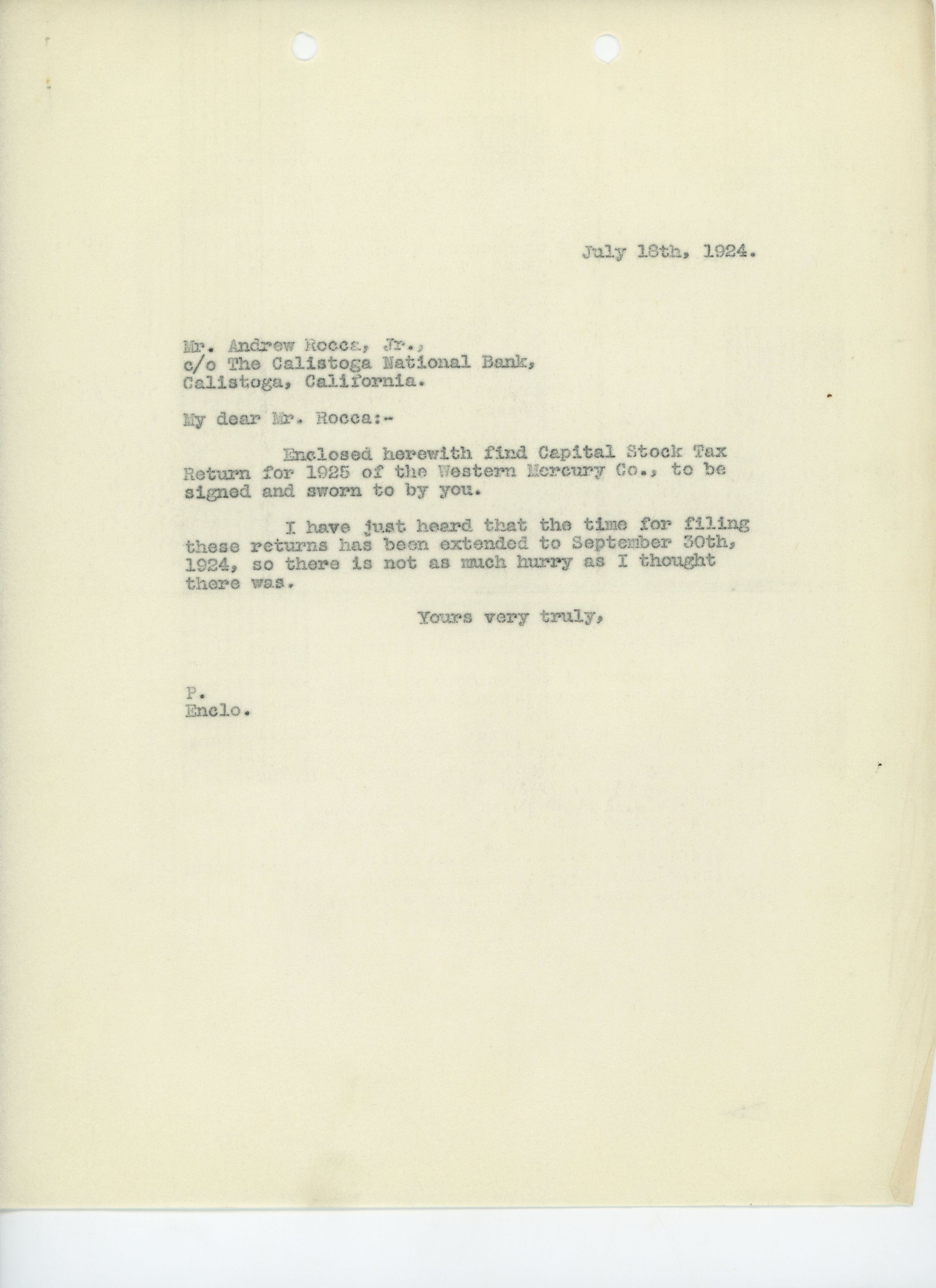 Unsigned letter to Andrew Rocca, Jr., regarding the Capital Stock Tax Return for 1925 for the Western Mercury Company.