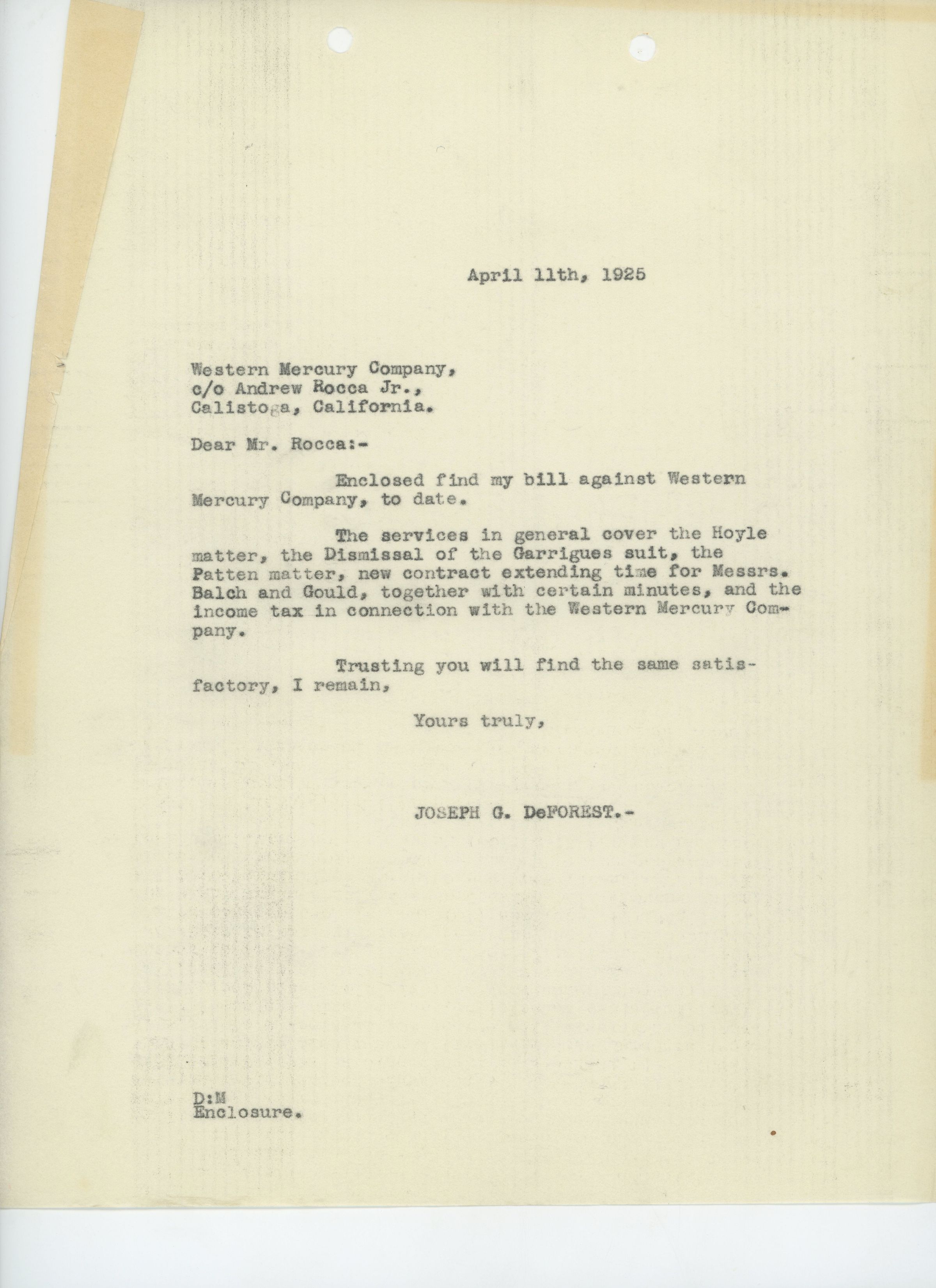 Letter to Andrew Rocca, Jr., from Joseph G. DeForest regarding DeForest's bill for services rendered to the Western Mercury Co. DeForest outlines the services he provided.