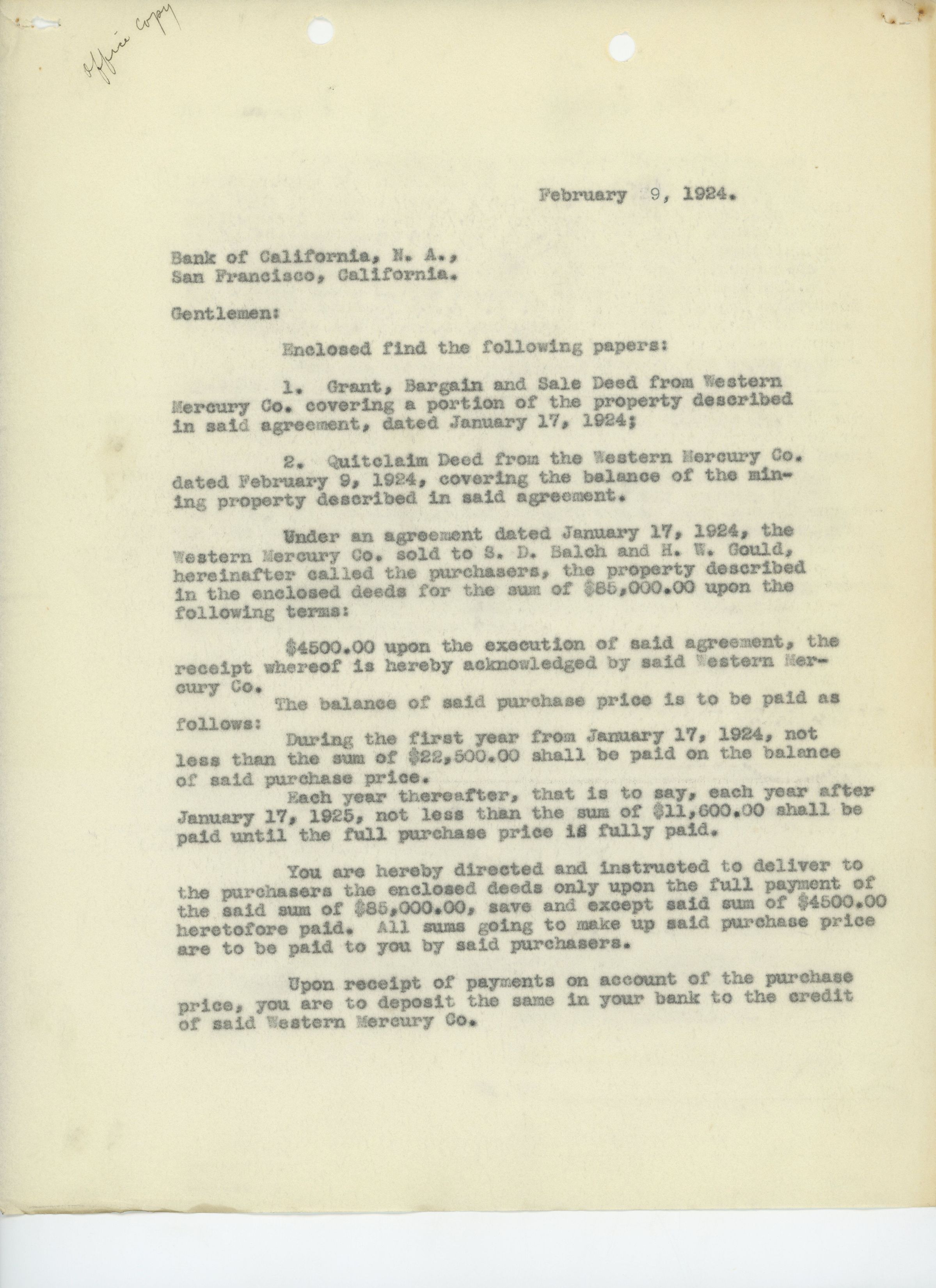 Two copies of a letter to the Bank of California regarding the details of a sale of property worth $85,000 owned by the Western Mercury Company to S.D. Balch and H.W. Gould. The letter discusses the payment plan and when title will be transferred to Balch and Gould. 2023.02.170A is signed by Andrew Rocca, Jr., the secretary, Balch, and Gould. 2023.02.170B is signed by Rocca, the secretary, Gould, and a representative of the Bank of California.Name/Title