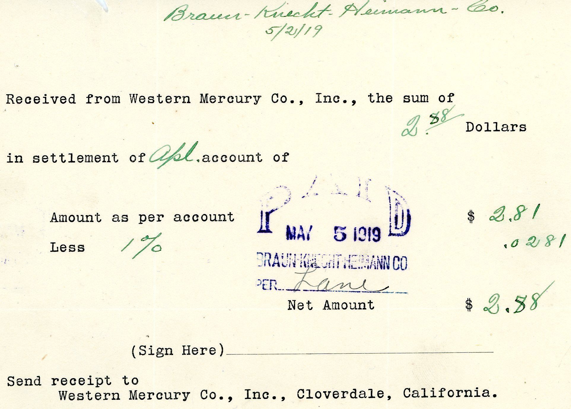 Sales receipt from Braun-Knecht-Heimann-Co. to the Western Mercury Co. dated May 5, 1919, for the amount of $2.88