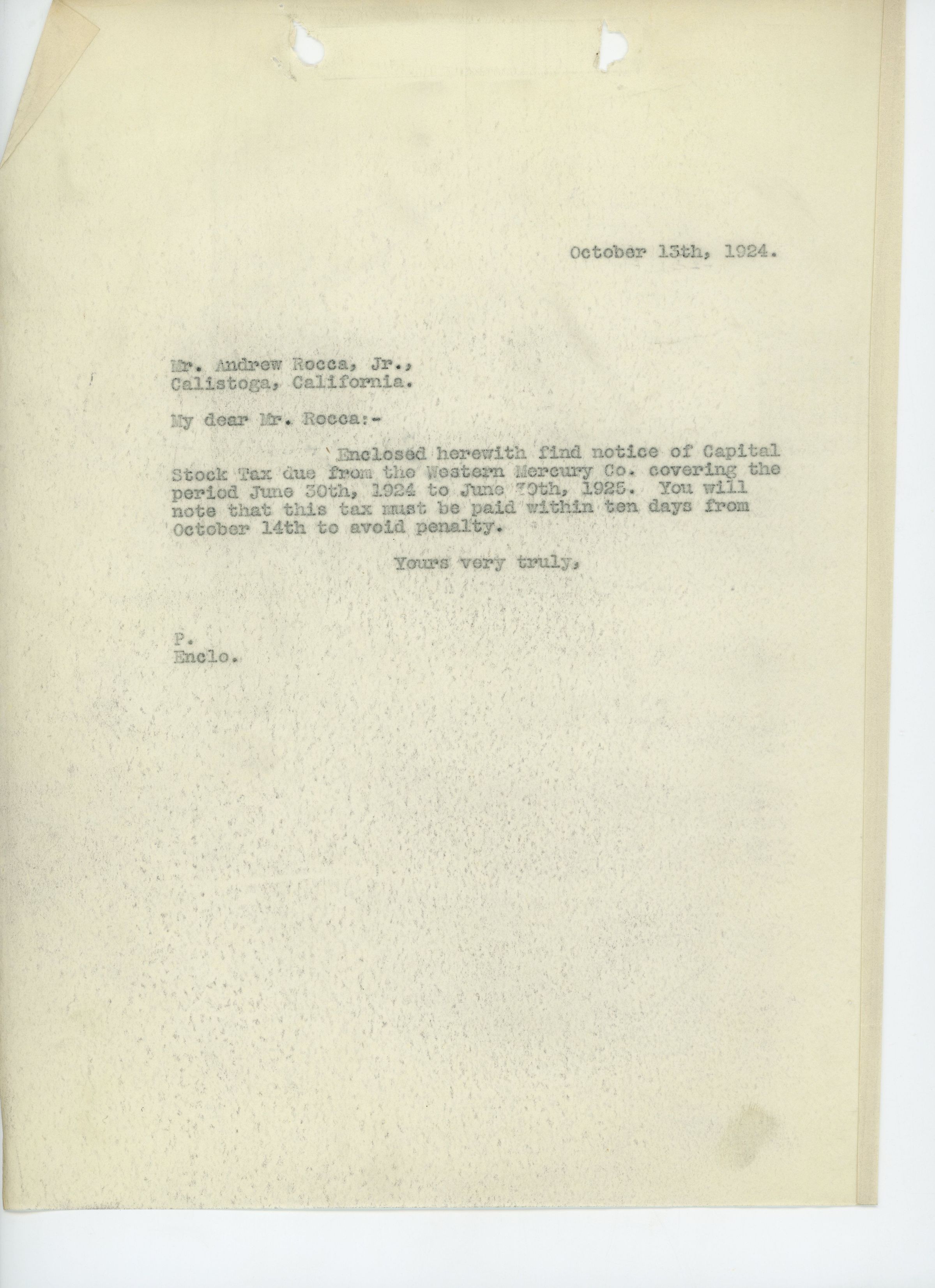 Unsigned letter to Andrew Rocca, Jr. regarding the 1925 Capital Tax Return of the Western Mercury Company.