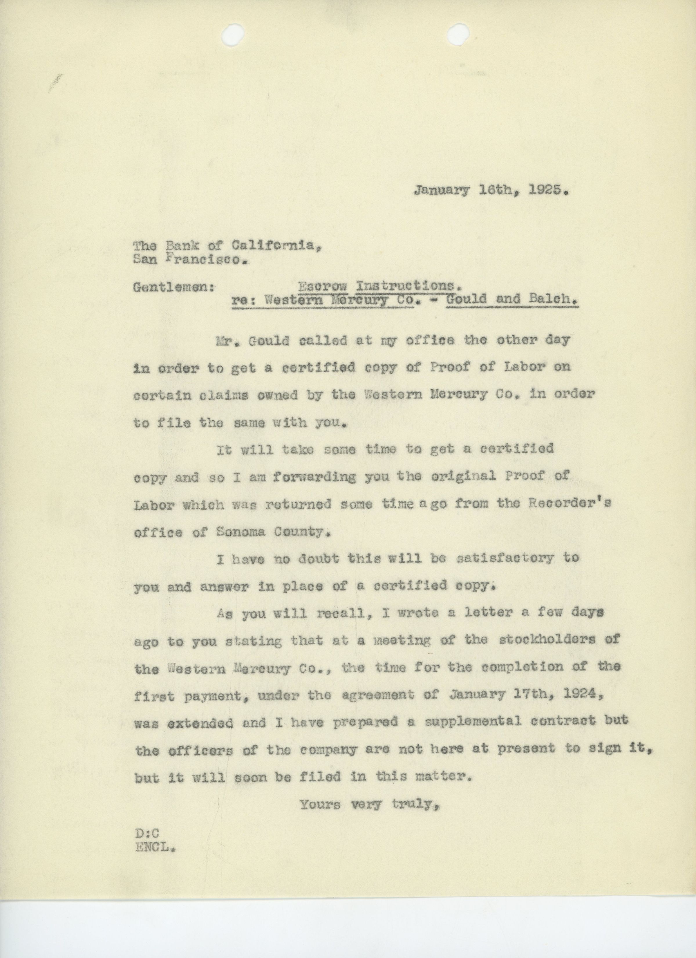 Unsigned letter to the Bank of California titled "Escrow Instructions re: Western Mercury Co. - Gould and Balch" regarding revised escrow instructions between the Western Mercury Company and Gould and Balch