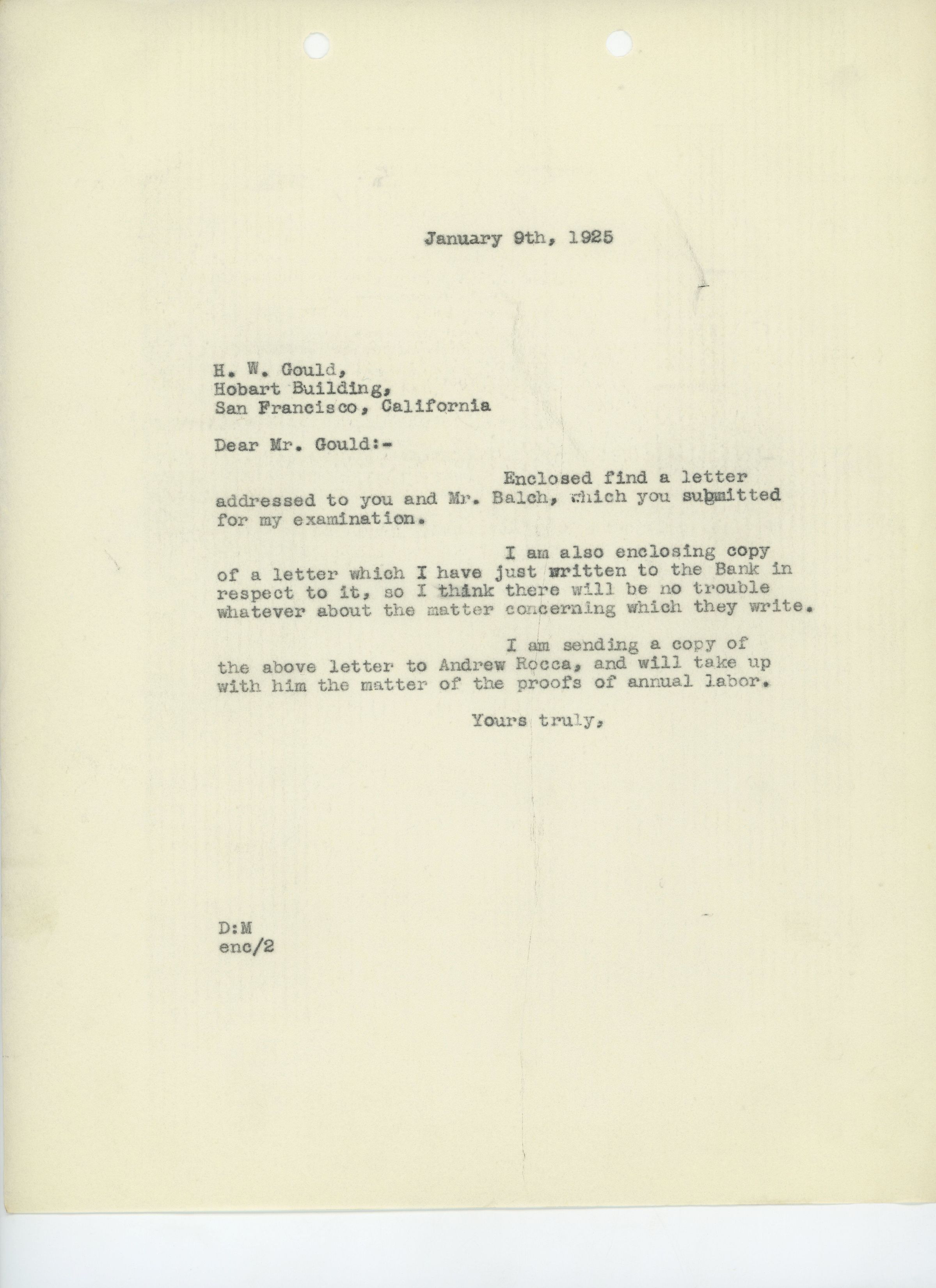 Unsigned letter to H. W. Gould regarding correspondence between Balch and Gould, the Bank of California, and the sender