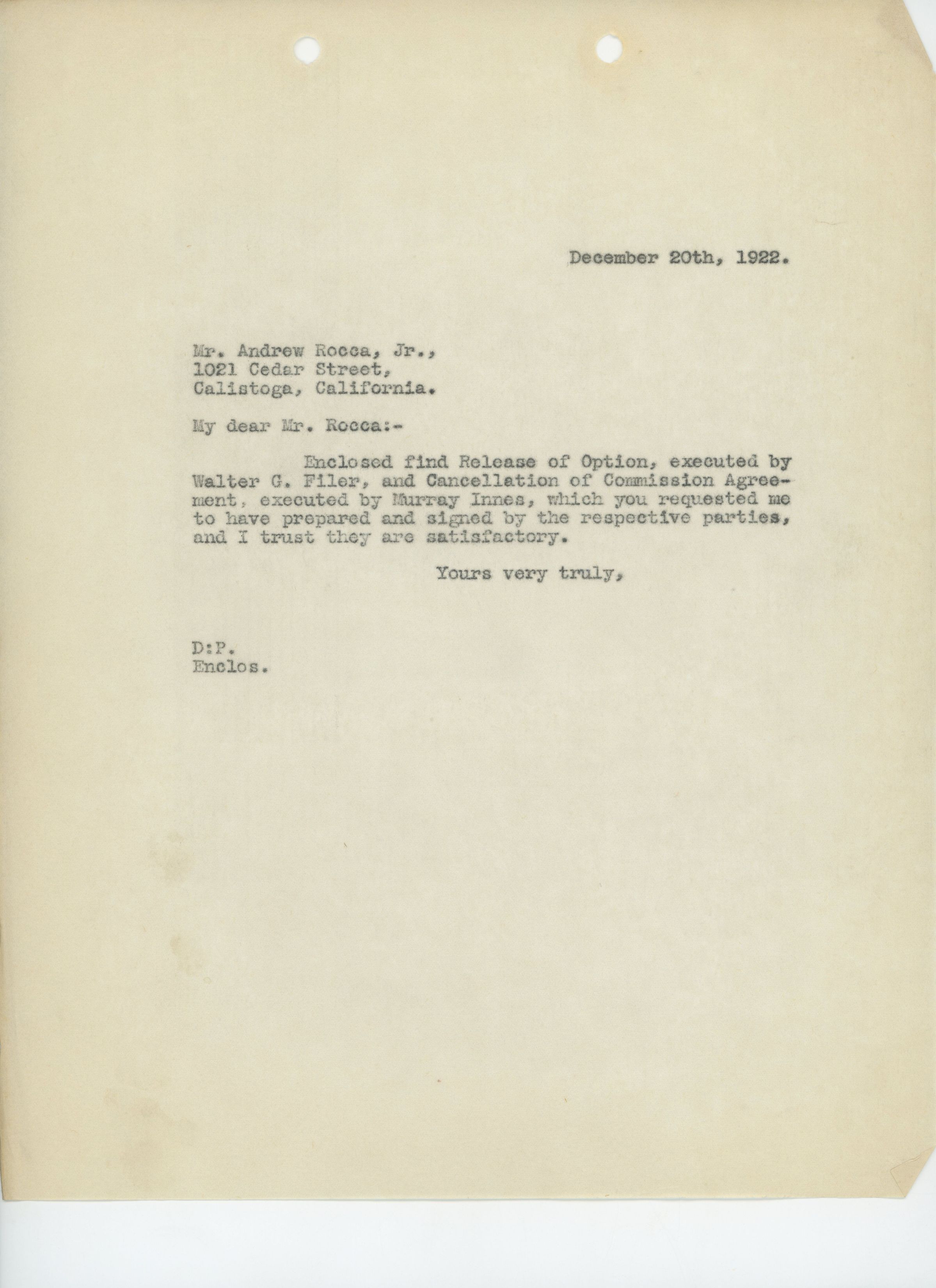 Unsigned letter to Andrew Rocca, Jr., regarding a Release of Option