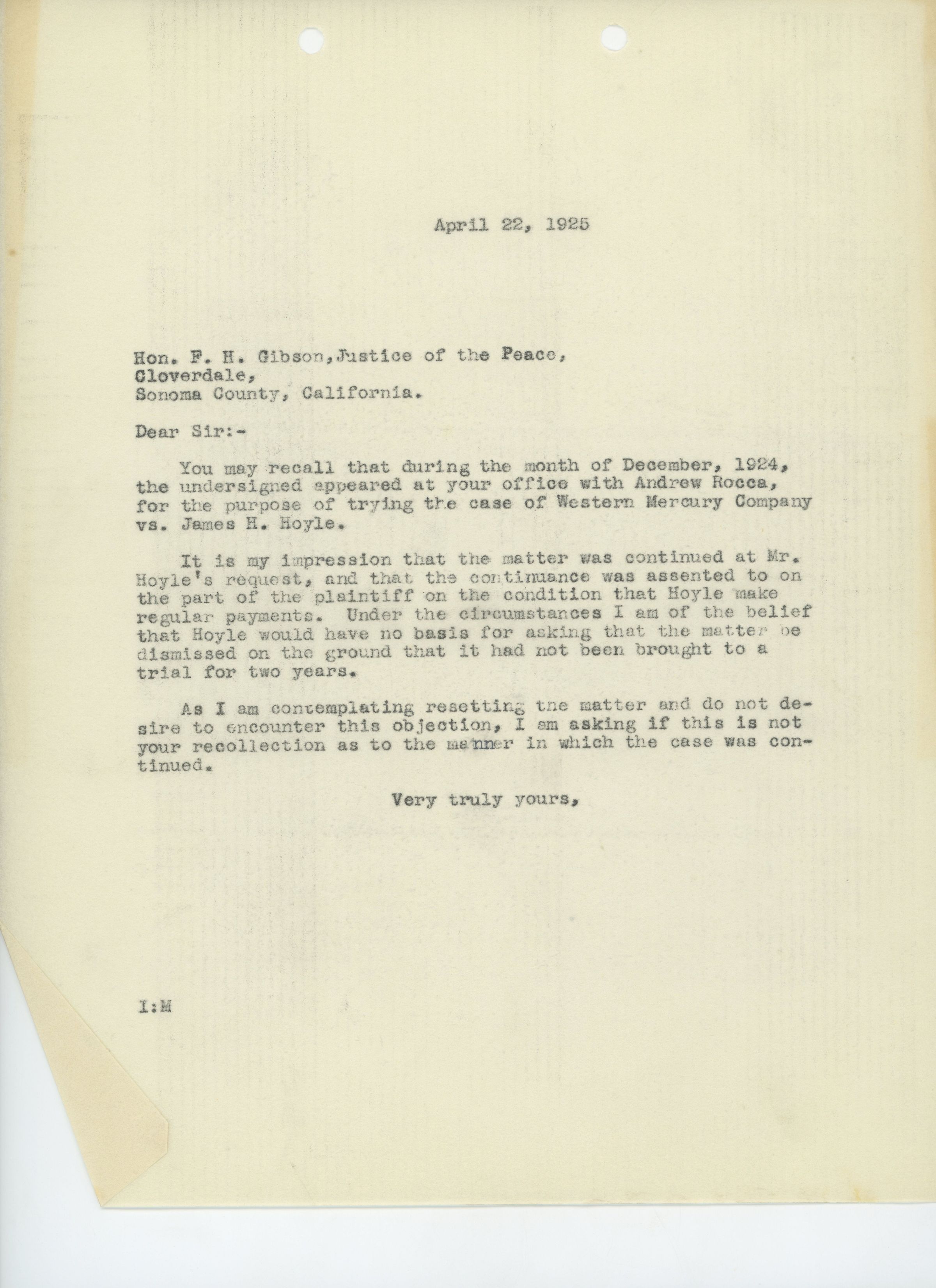 Unsigned letter to F. H. Gibson, Justice of the Peace in Cloverdale, CA, regarding a lawsuit brought against the Western Mercury Co. by James H. Hoyle