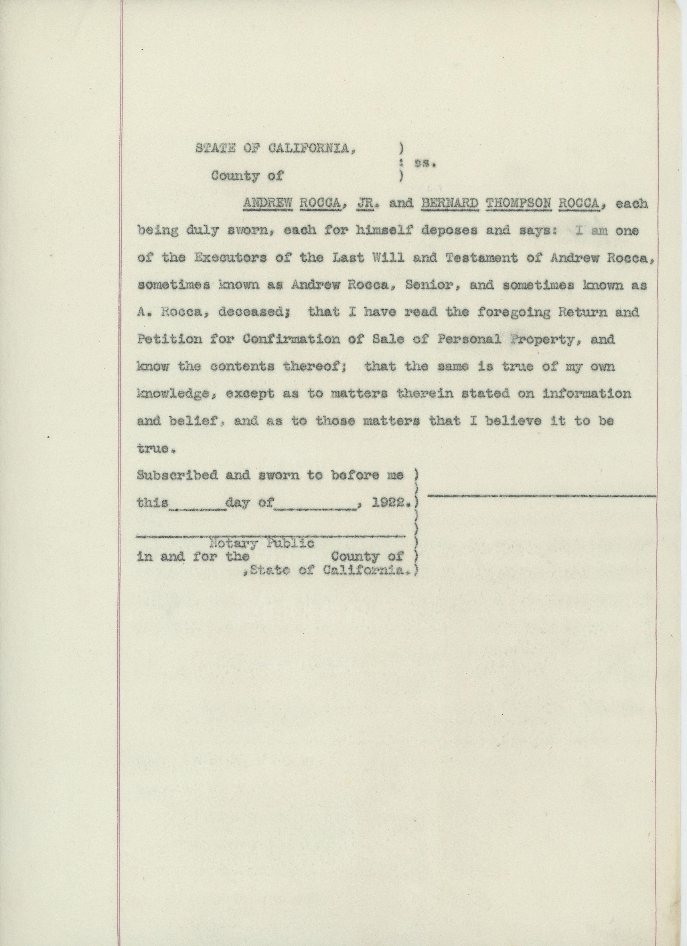 Copy of a sworn document by Andrew Rocca, Jr., and Bernard Rocca as the executors regarding the sale of property from the estate of Andrew Rocca, Sr.