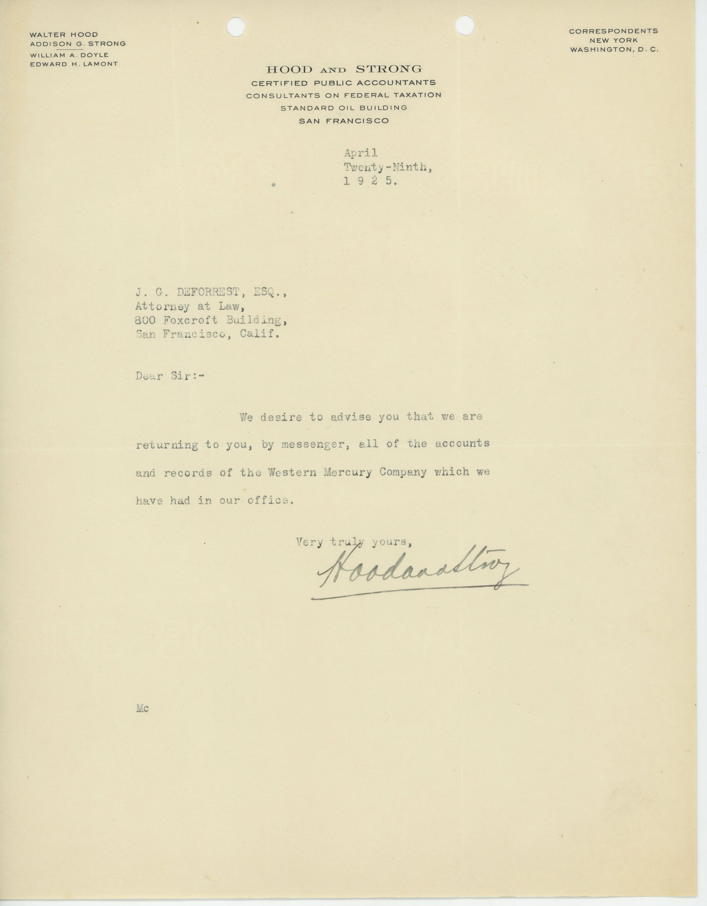 Letter to J. G. DeForrest from Hood and Strong, an accounting firm, regarding the return of accounts and records for for the Western Mercury Company.