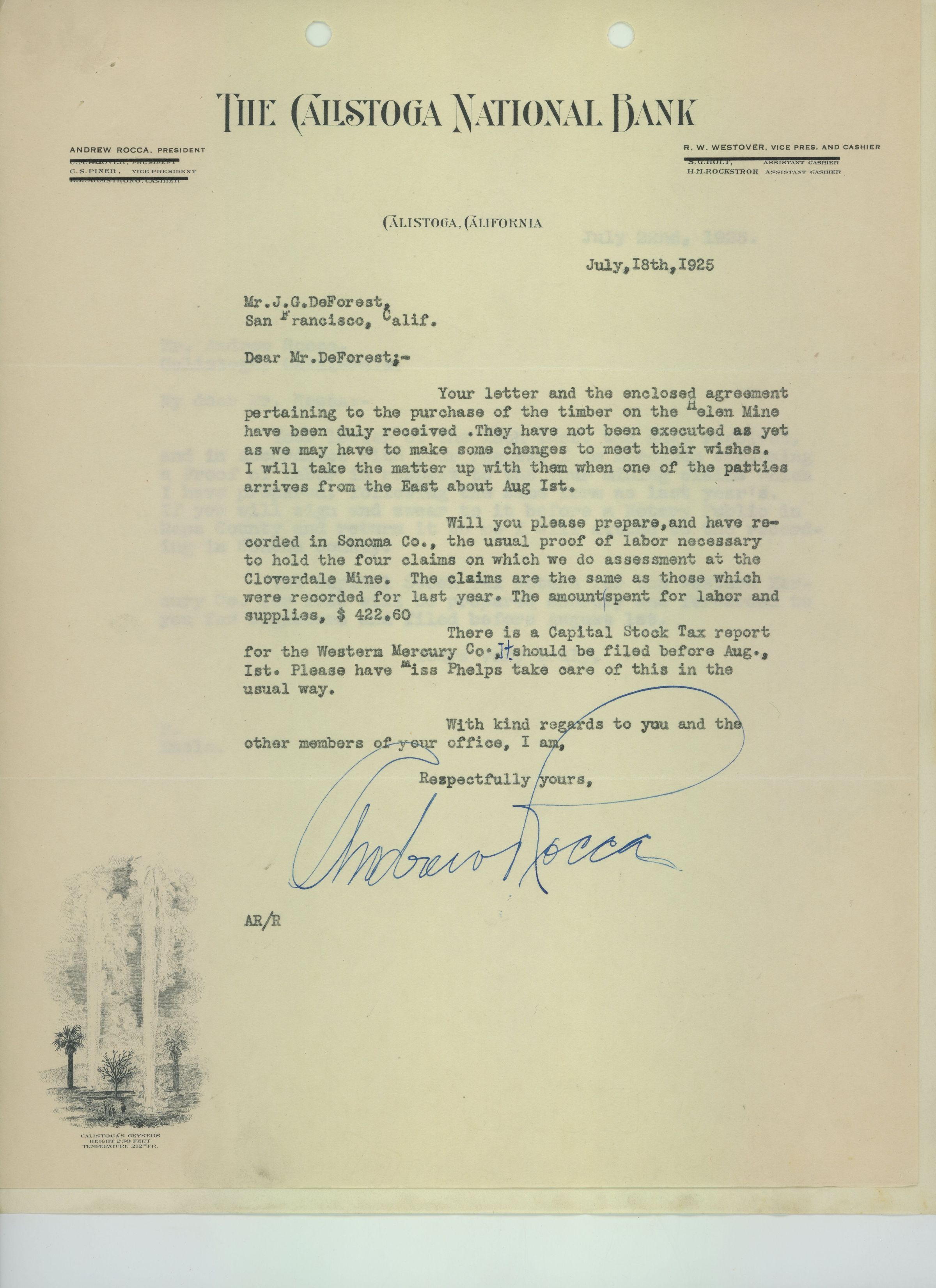 Two letters pasted together in the corner. The first letter to J.G. DeForest from Andrew Rocca dated July 18, 1925, discusses details of timber purchasing for the Helen Mine. The second letter, dated July 22, 1925, is addressed to Andrew Rocca but is unsigned. It is presumably DeForest's reply, as it mentions Rocca's letter of the 18th, and discusses what Rocca requests in that letter.Name/Title