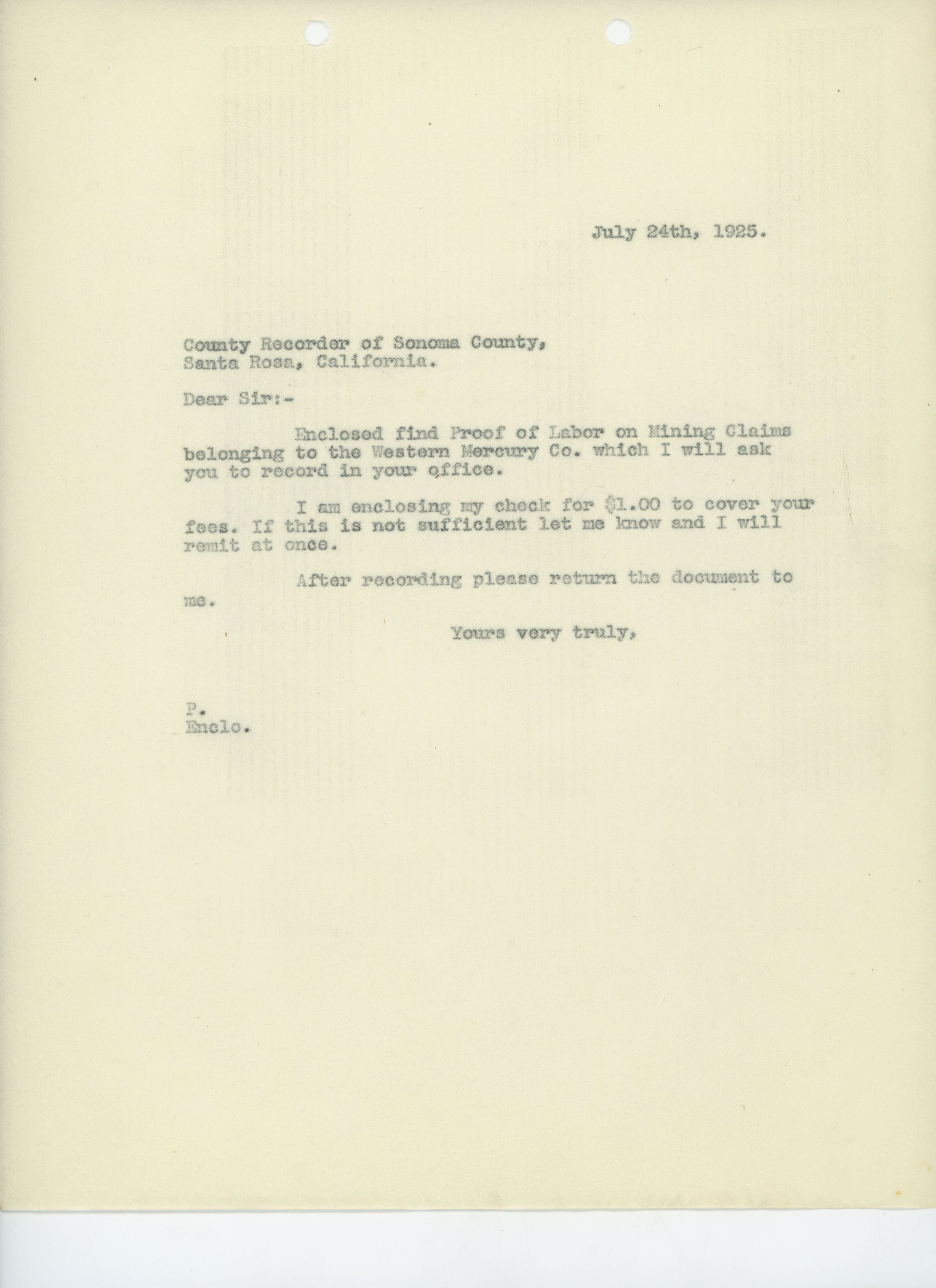 Unsigned letter dated July 24, 1925, to the County Recorder of Sonoma County regarding proof of labor on mining claims owned by the Western Mercury Co.