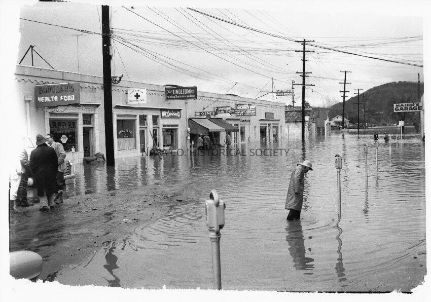 Floods, Flooding, 1950s, Pearl Street, Gardner's Health Food, Napa Charter American Red Cross, Napa Linoleum Co., Snyder's Gun Shop, Napa Merchandise Mart