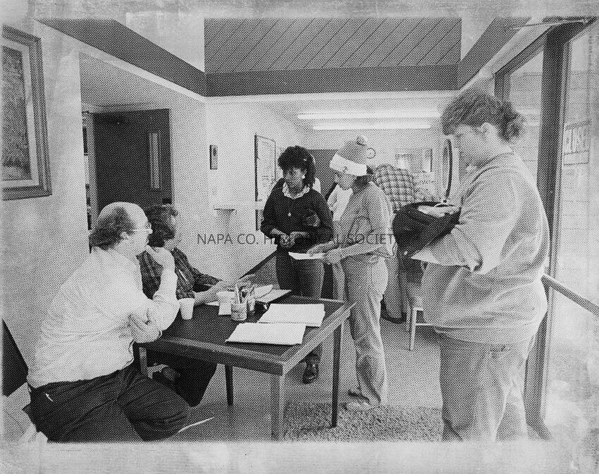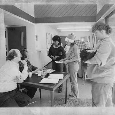A large black and white photograph of a group of people at a center set up for victims of the 1986 flood. Location: PF 117 A