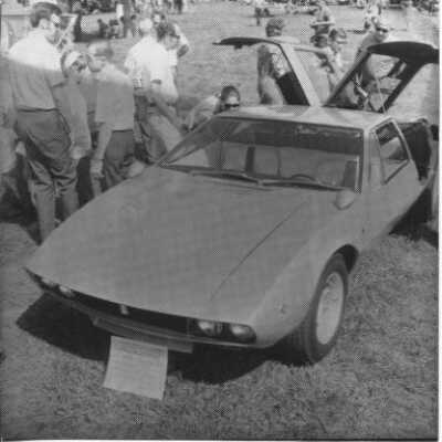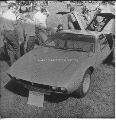 Black and white photograph of car at Concours D' Elegance. Note on back of photo reads " Owner Eugene James 1969 De Tomaso Mangusta Concours D' Elegance"
