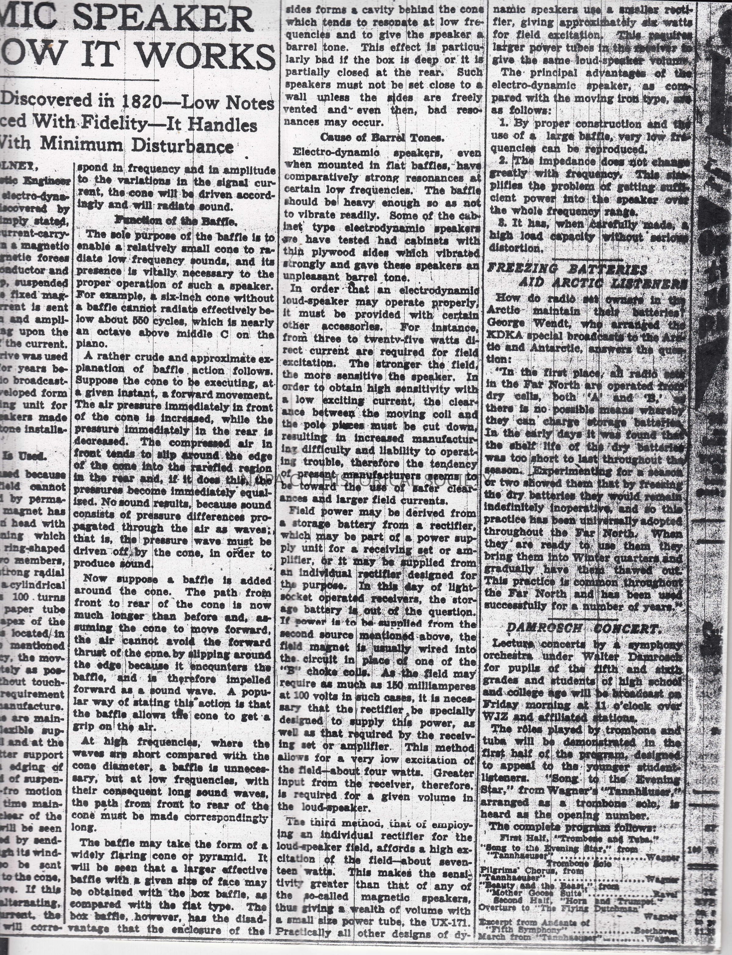 Copy of article on Magnavox loudspeaker, "Dynamic Speaker and How It Works: Principle Was Discovered in 1820 - Low Notes Are Reproduced With Fidelity - It Handles Volume With Minimum Disturbance" by Benjamin Olney, unknown newspaper and undated. Location: digital only