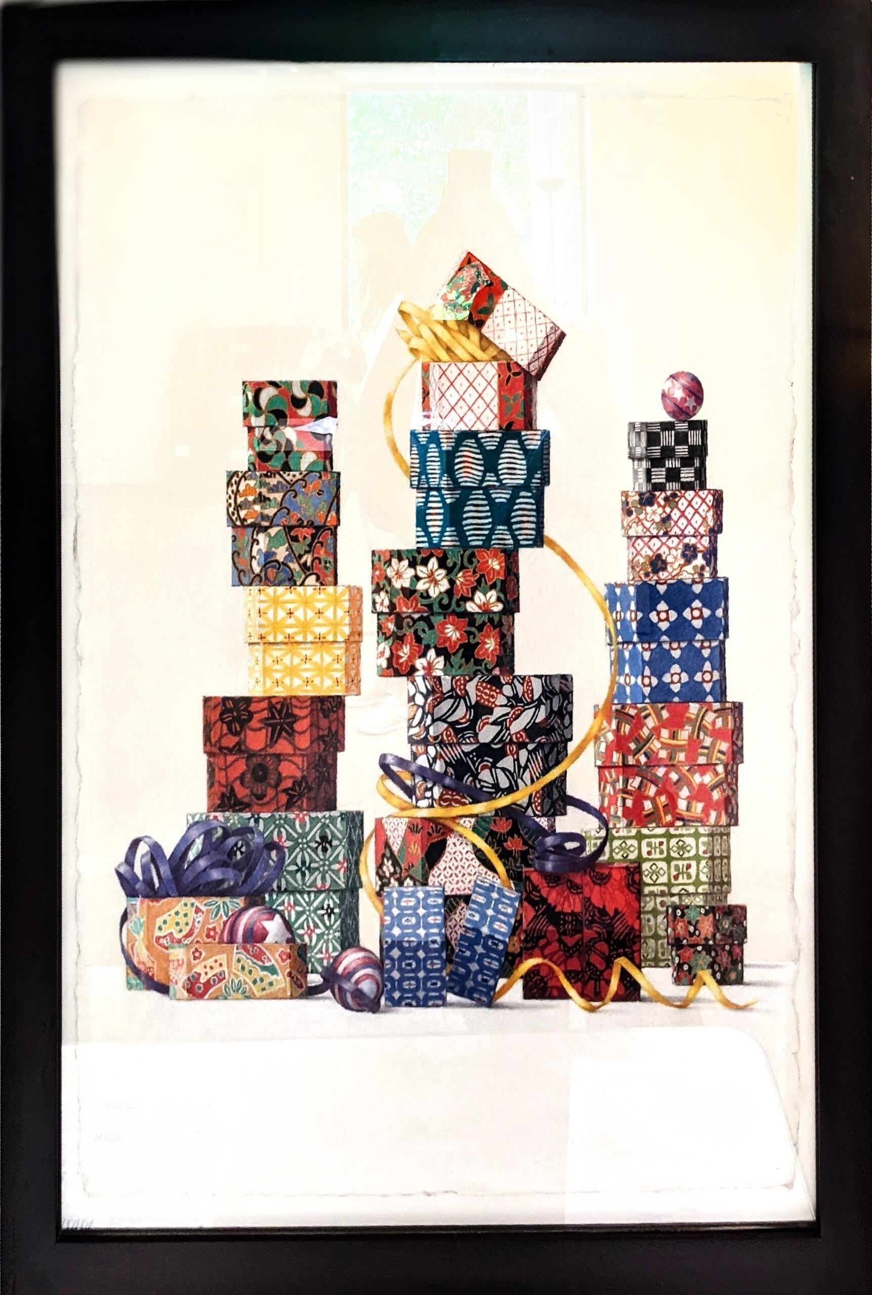 A still life arrangement with three stacks of boxes covered with various papers and ribbons set in a modern wood frame painted black with a mat and glazing.Artwork Details