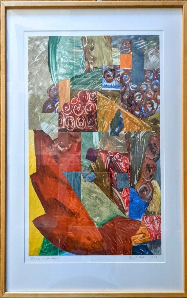 A montage of brightly colored abstract forms set in a modern wood frame with a mat and glazing.Artwork Details