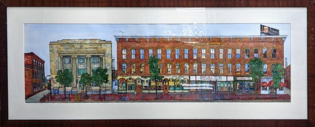 An image on the west side of Main street in Nashua including the Bank of New Hampshire. The work is set in a modern wood frame with a mat and glazing.Artwork Details
