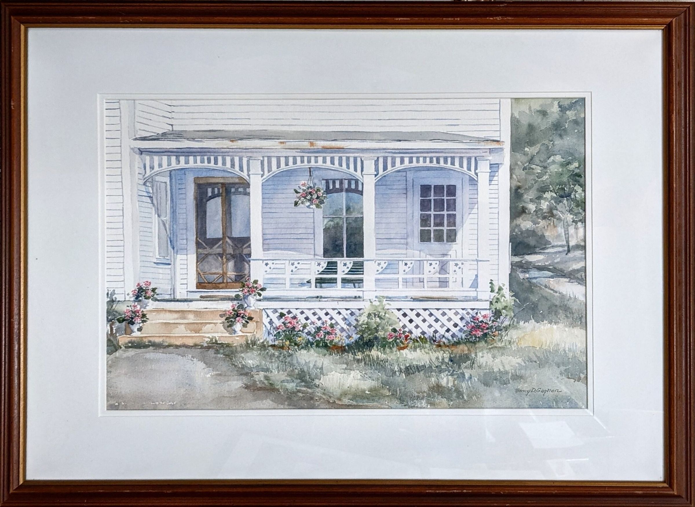 An image predominated by the front porch of a Victorian house divided into three arched spaces. The work is set in a modern wood frame with a doible mat and glazing.Artwork Details