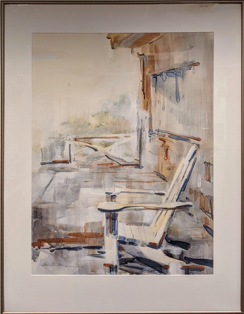 An image looking over a porch with a white slated chair in the foreground. The work is set in a modern metal frame with a mat and glazing.Artwork Details