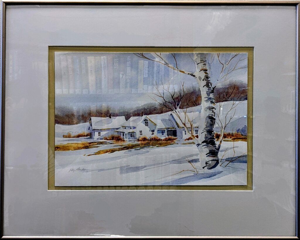 A snow covered composition looking over a field with a birch tree at the right toward a group of white houses. The work is set in a modern metal frame with a mat and glazing.Artwork Details