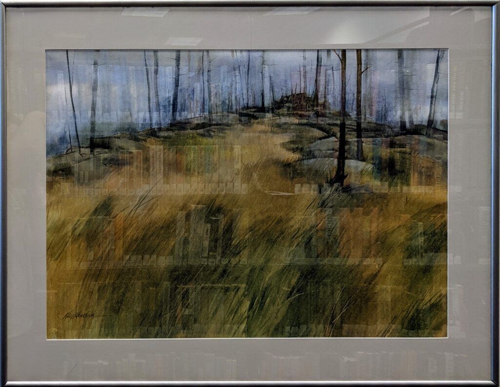 An image overlooking a field flanked by trees set in a modern metal frame with a mat and glazing.Artwork Details