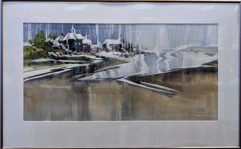 An image overlooking a body of water toward a dock with two houses set in a modern metal frame with a mat and glazing.Artwork Details