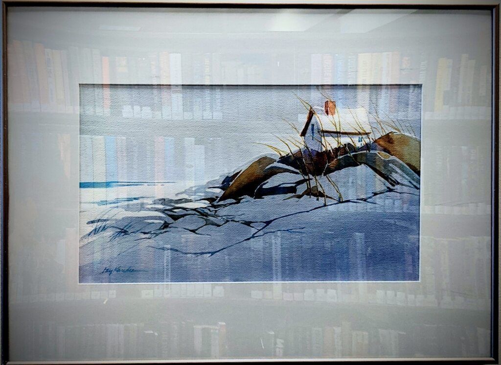 An image looking from a beach over large boulders toward a white house set in a modern metal frame with a mat and glazing.Artwork Details