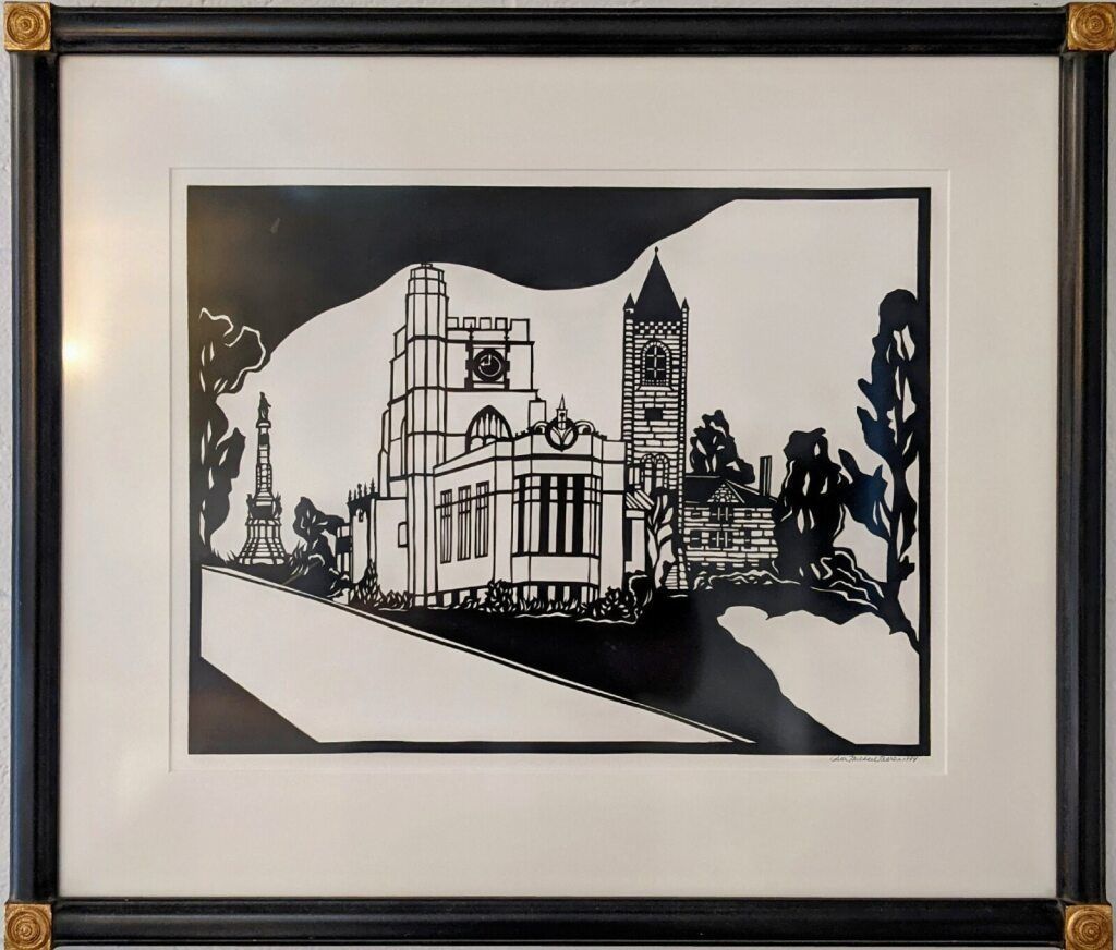 A black cutting of an Art Deco building next to a Neo-Romanesque tower with a view to a distant monument set on a white ground and set in a modern wood frme with gold painted corners with a white mat and glazing.Dimensions