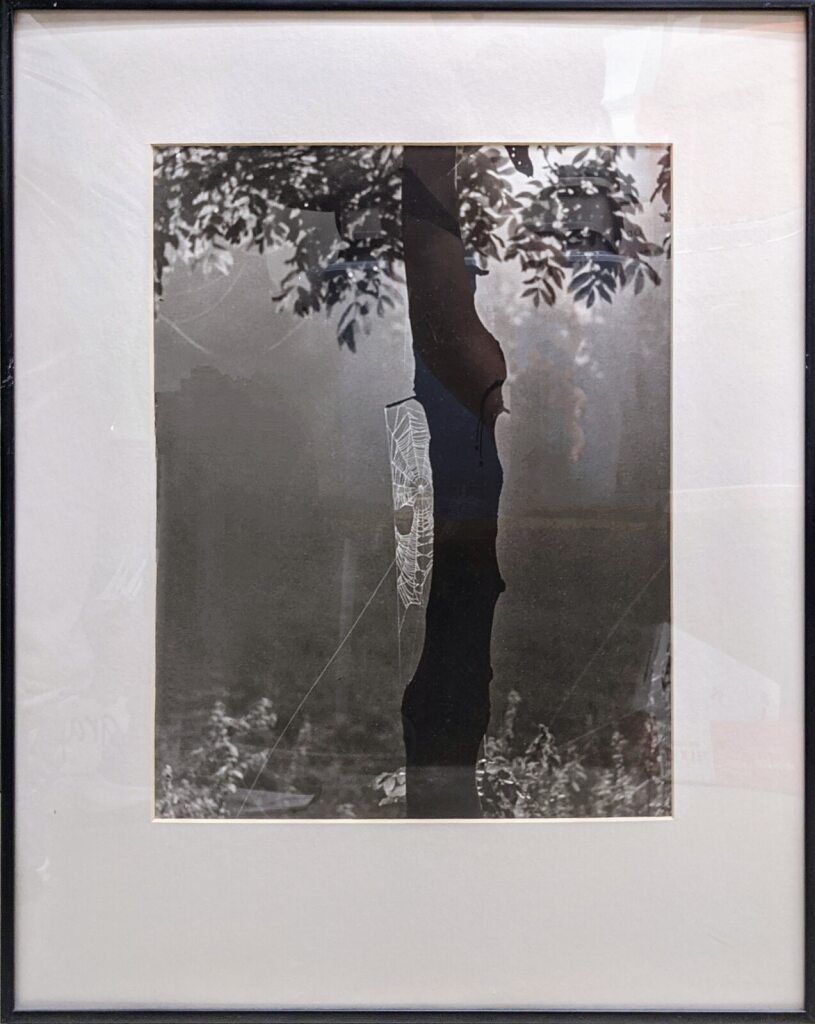 An image of a spider's web on the trunk of a tree illuminated by the sun set in a modern black frame with a mat and glazing.Photograph Details