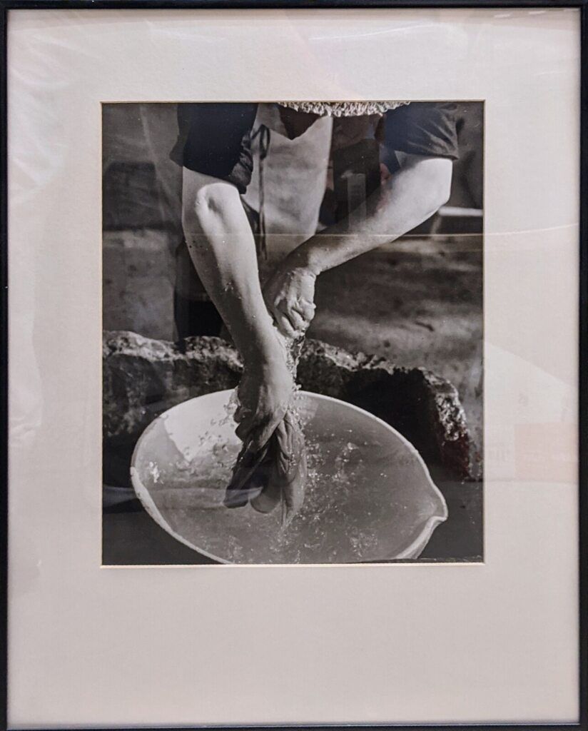 An image predominated by the hands and arms of a woman rinsing laundry above a white bowl. The work is set in a modern black metal frame with a mat and glazing.Photograph Details