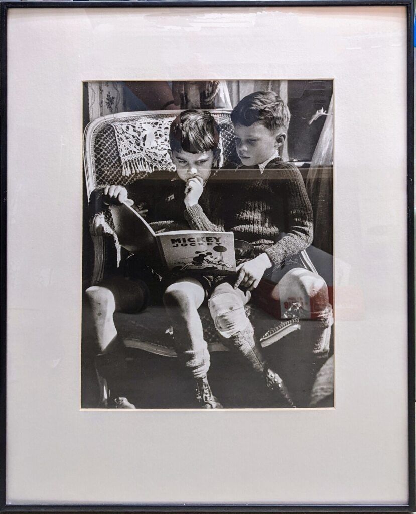 A full-length image of two boys wearing dark sweaters and shorts seated in a chair and reading a Mickey Mouse book. The work is set in a modern black frame with a mat and glazing.Photograph Details
