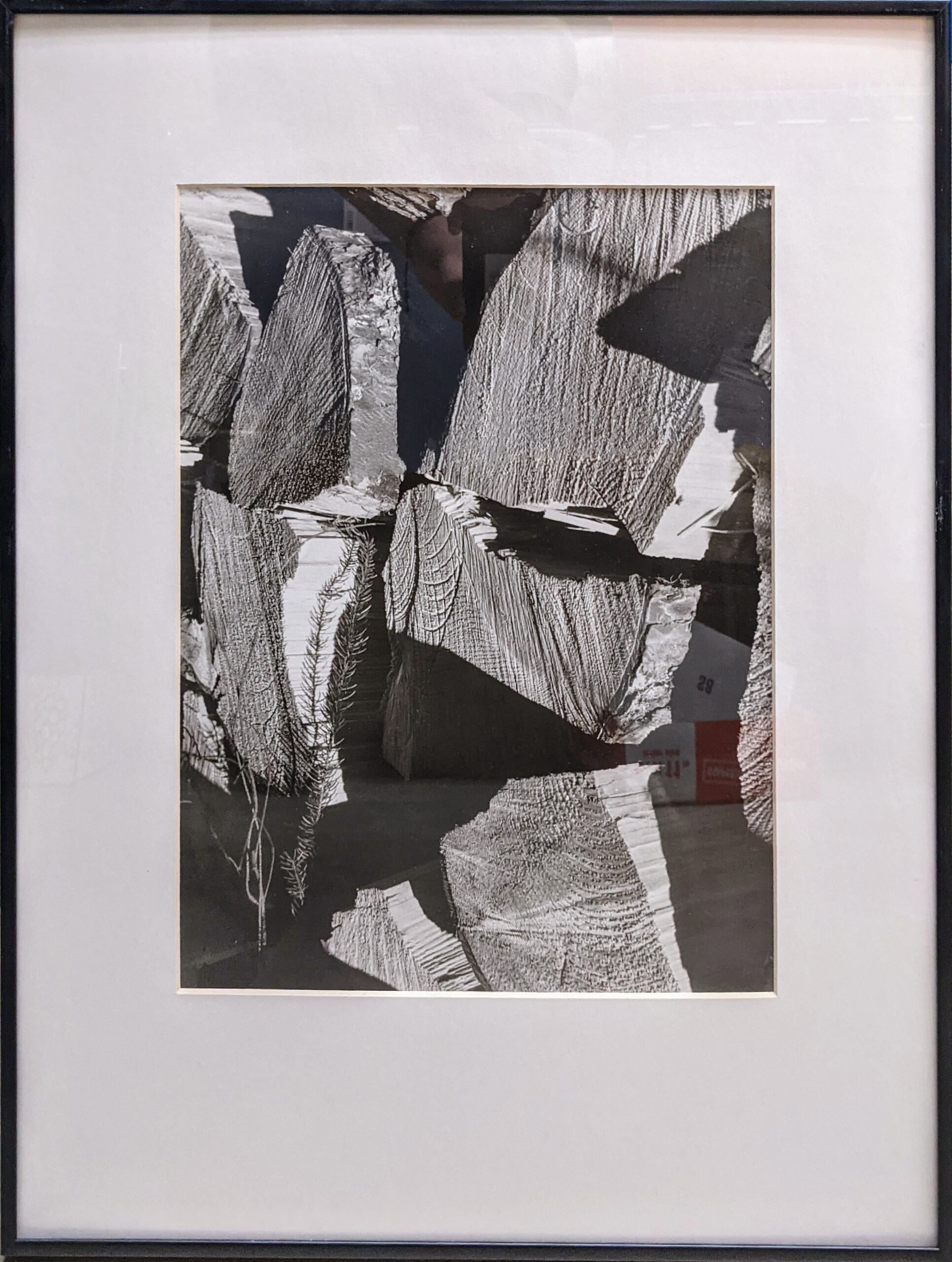 An image predominated by the ends of quartered logs set in a modern black metal frame with a mat and glazing.Photograph Details