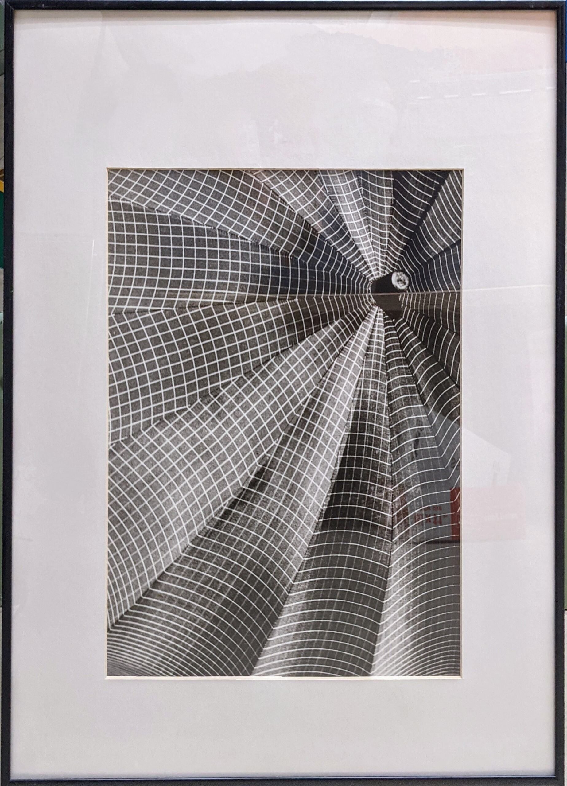 An image predominated by the patterning of a checked parasol set in a modern black metal frame with a mat and glazing.Photograph Details