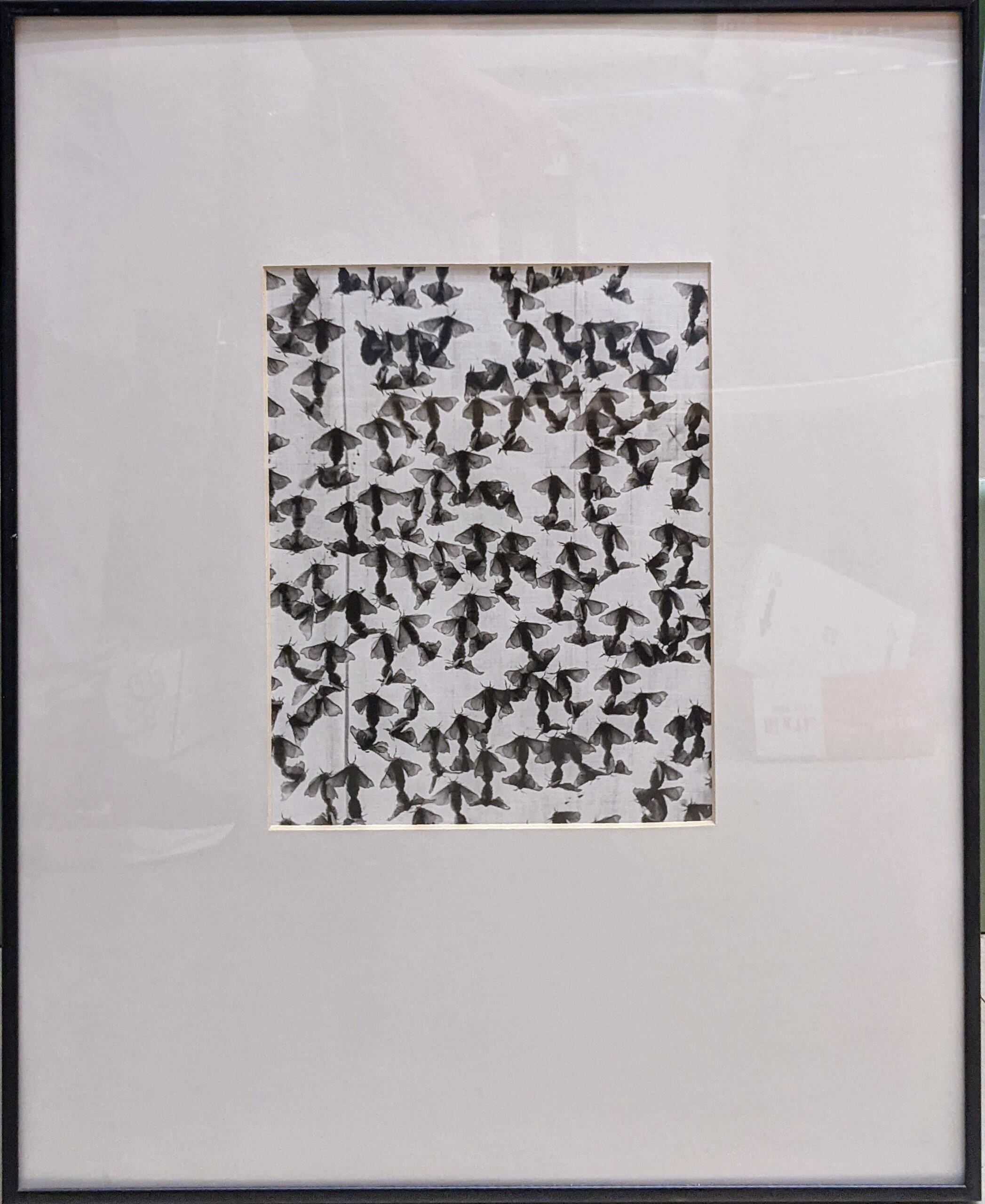 An image predominated by a large group of silk moths against a white ground and set in a modern black metal frame with a mat and glazing.Photograph Details