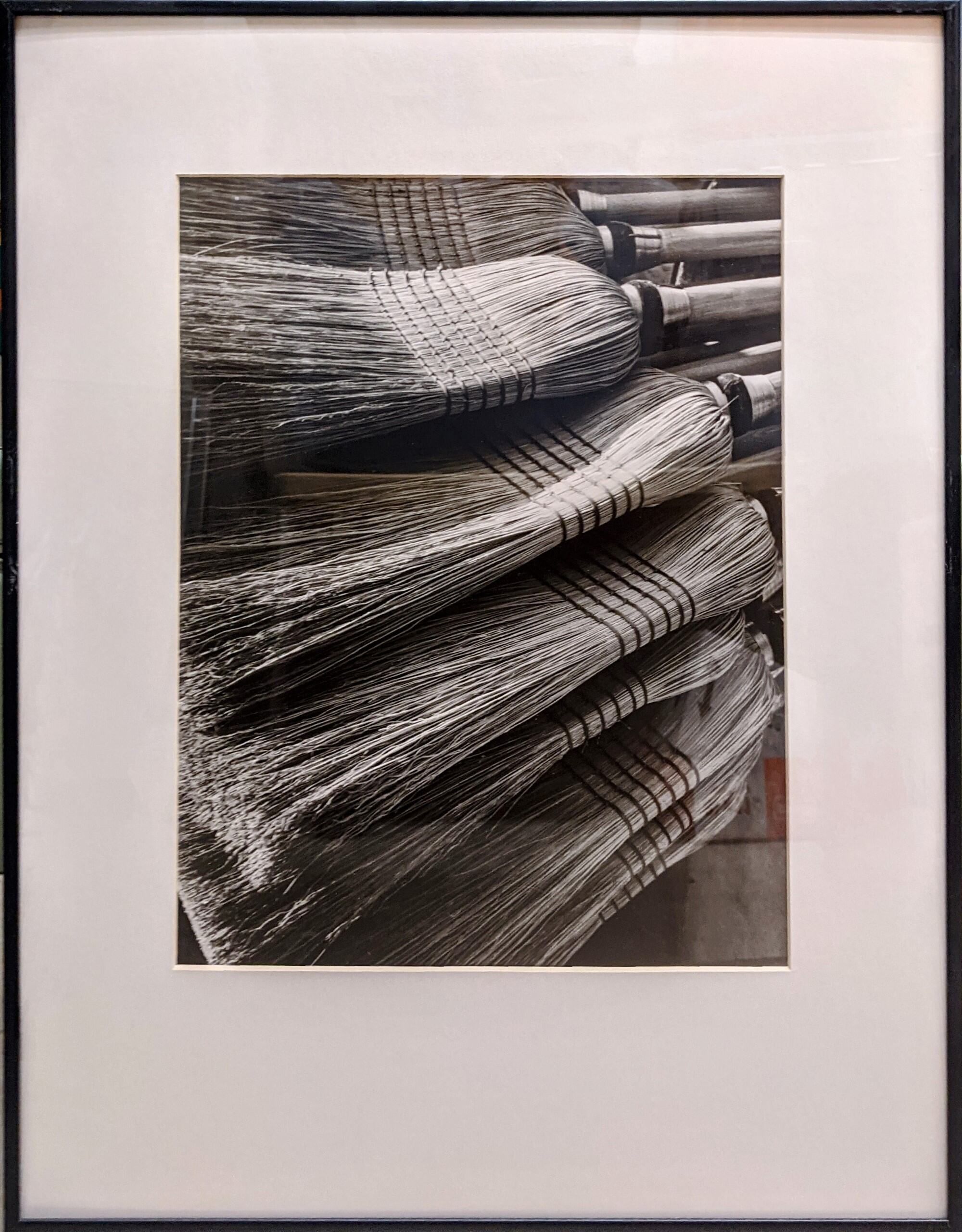 An image predominated by a group of stacked brooms set in a modern black frame with a mat and glazing.Photograph Details