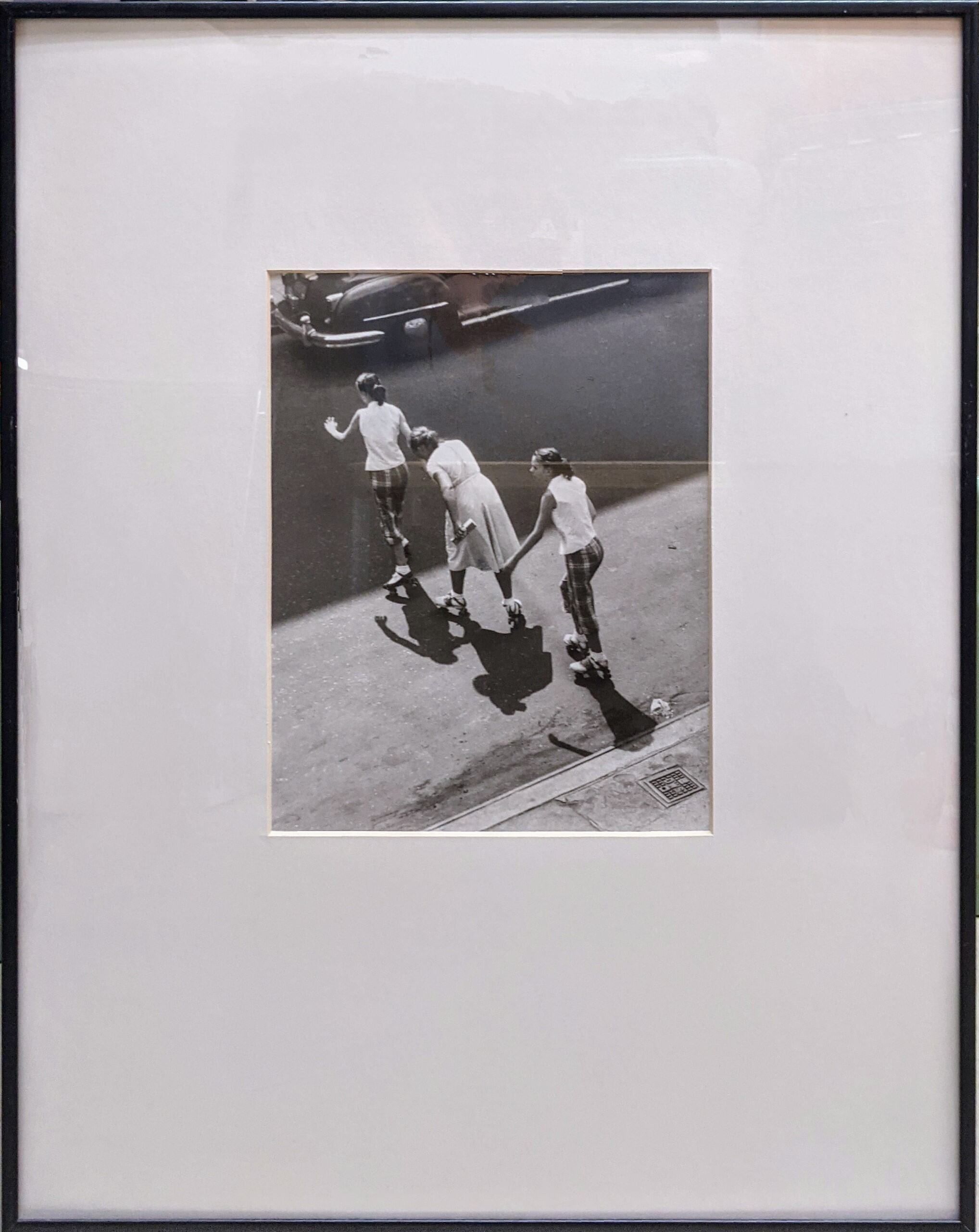 A bird's-eye view of three girls crossing a street in roller-skates set in a modern black frame with a mat and glazing.Photograph Details
